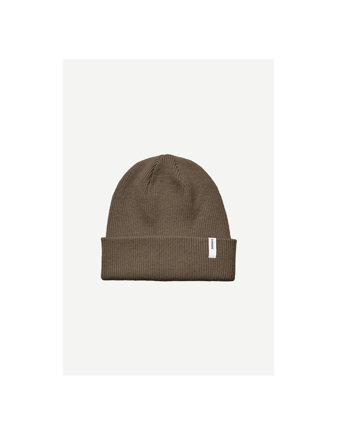 This beanie hat has been made in wool blend yarn. Knitted in a rib stitch with shaping at the top and a turn back hem for a neat fit. Finished with Samsøe Samsøe logo label.