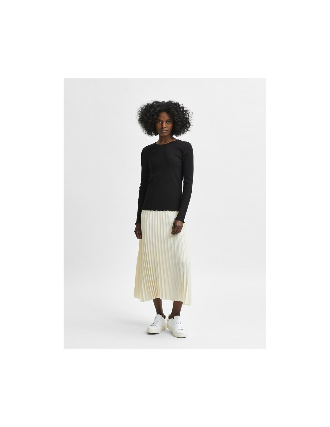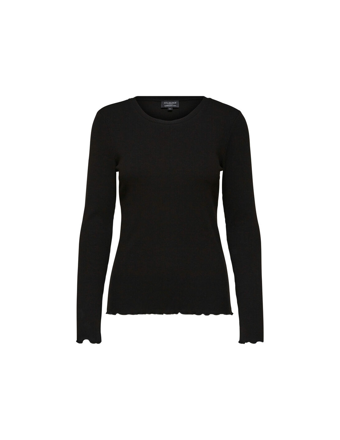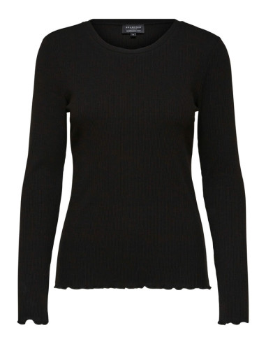 Hjälteplagg är ofta de som inte alltid sticker ut mest, utan de som håller hela livet. En enkel men mångsidig långärmad topp är en sådan hörnsten; den har en finribbad struktur och volangkanter som gör den extra söt. Den är också skuren i en smal passform, vilket gör den perfekt som lager. Bär den med ljustvättad denim och en yllekofta.