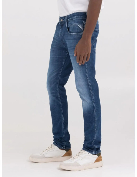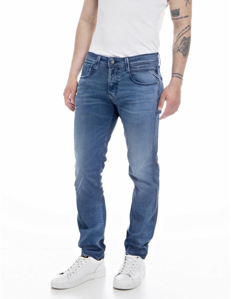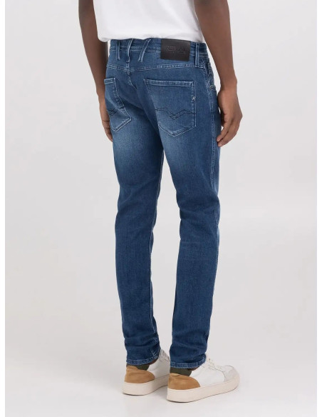 Slim fit jeans with regular waist and wide tapered leg for a comfort fit. With an authentic look, the garment is made of 10,5 oz dark indigo super stretch cotton denim with a medium wash tone. The five pocket item is characterized by the lasered whiskers on used areas. Zip and button fly.