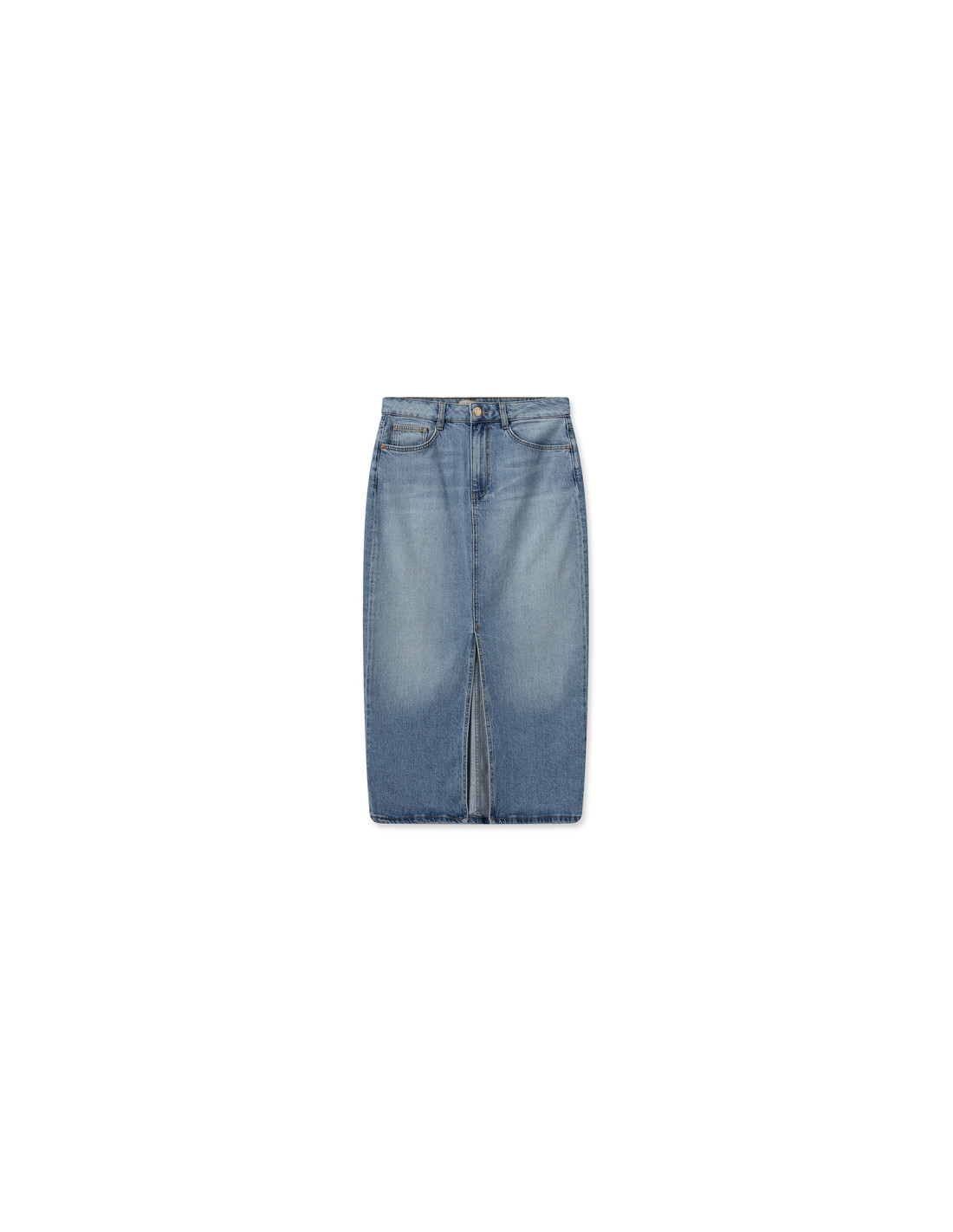 Trendy denim skirt designed in a long fit. It's finished with a slit at the front, pockets, and a leather badge at the back. Wear it with anything from statement tees to chunky knits and shirts.