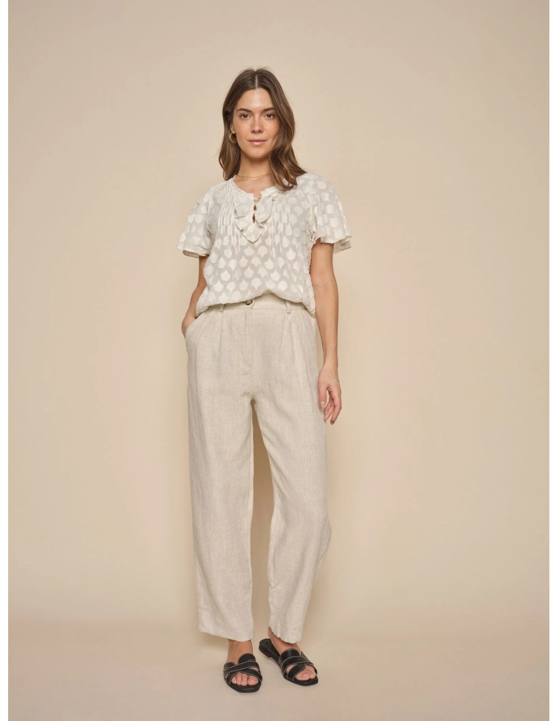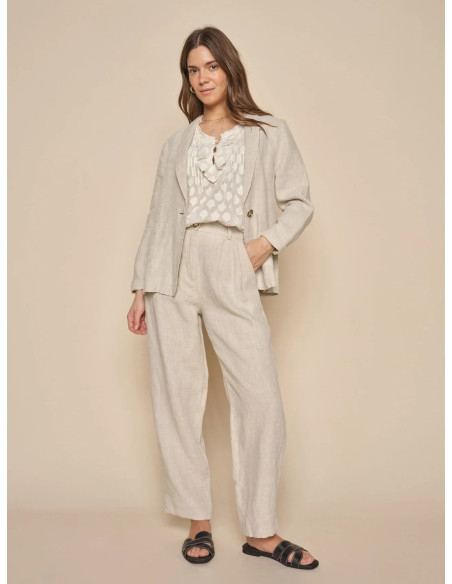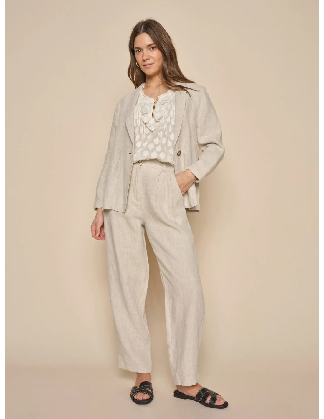 Crafted from linen, these stylish, high-rise pants have a trendy mom fit. Detailing includes an elastic waistband, pleats, and practical pockets. For a chic ensemble, pair them with a corresponding linen blazer and a statement tee tucked in.
