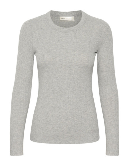 Grå ribbstickad t-shirt med långa ärmar och rund halsringning. Tröjan har en åtsittande passform.