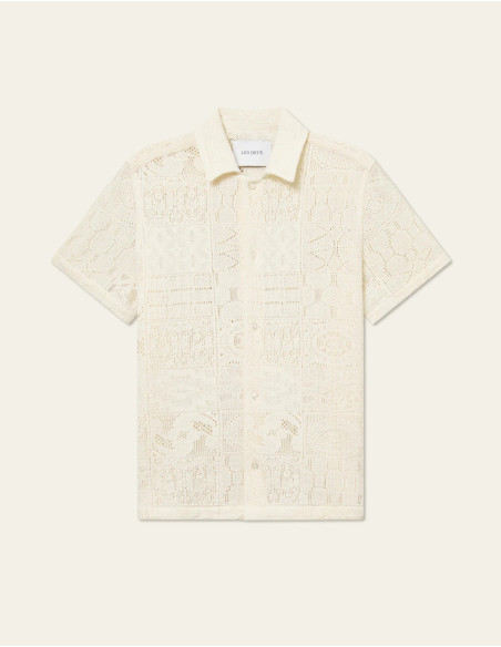 är en exklusiv kortärmad skjorta som kombinerar stil och komfort. Tillverkad i en blandning av 85% bomull, 13% polyester och 2% elastan, erbjuder den en mjuk och stretchig känsla. Den intrikata spetsdesignen ger en luftig och andningsbar kvalitet, vilket gör den idealisk för varmare dagar. Skjortan har en klassisk krage, knappar i pärlemorstil och en oplisserad yoke för en ren och modern look. Med en lös passform ger den en avslappnad och bekväm silhuett. Denna skjorta är ett utmärkt val för den stilmedvetna mannen som söker något utöver det vanliga.