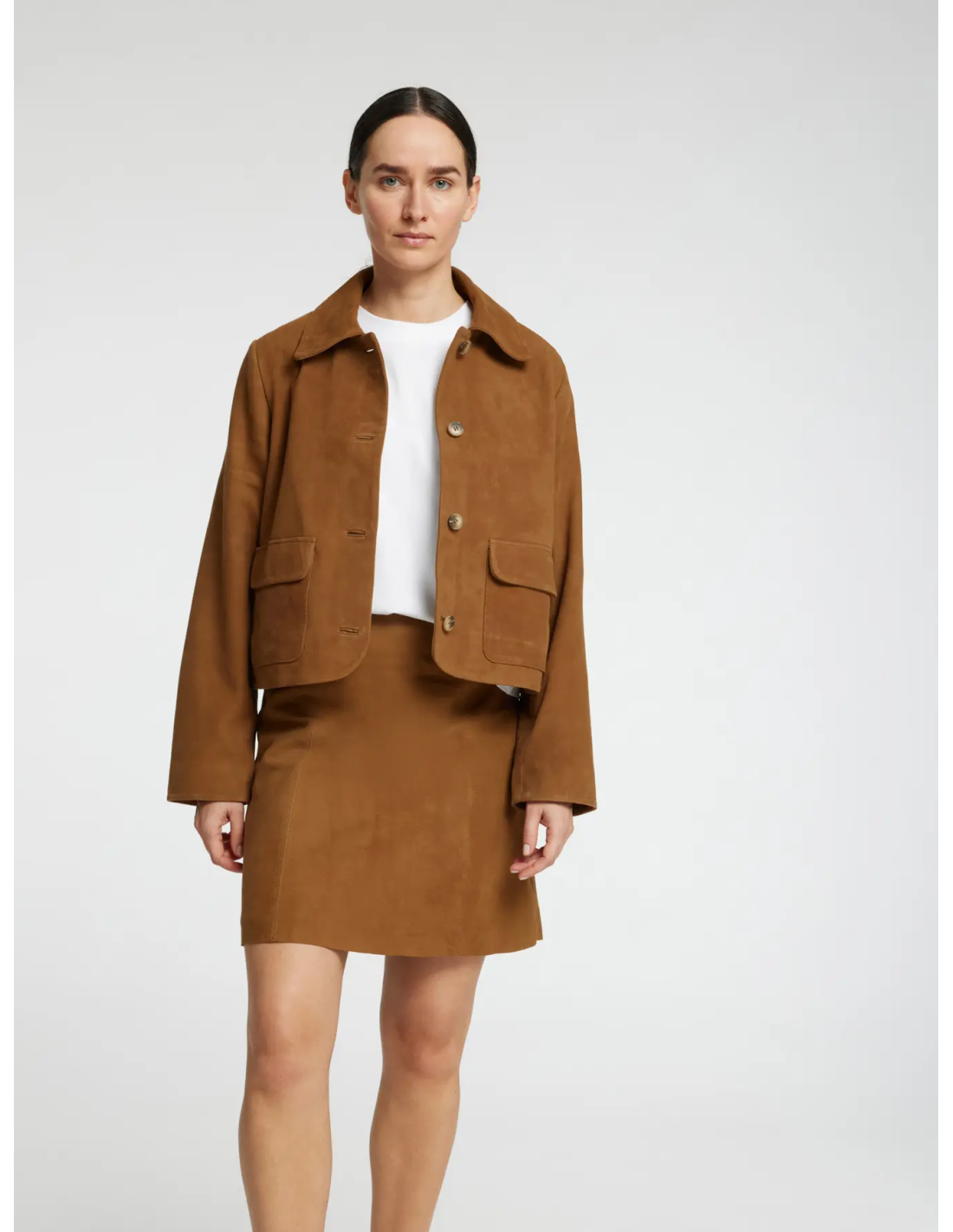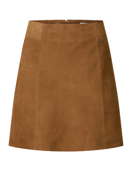 är en elegant och sofistikerad kjol i mjukt mocka. Designad för att ge en lyxig känsla och en modern silhuett, perfekt för både vardag och mer uppklädda tillfällen. Kjolen har en vacker passform som smickrar kroppen och en klassisk midjepassform som gör den enkel att kombinera med både blusar och tröjor.