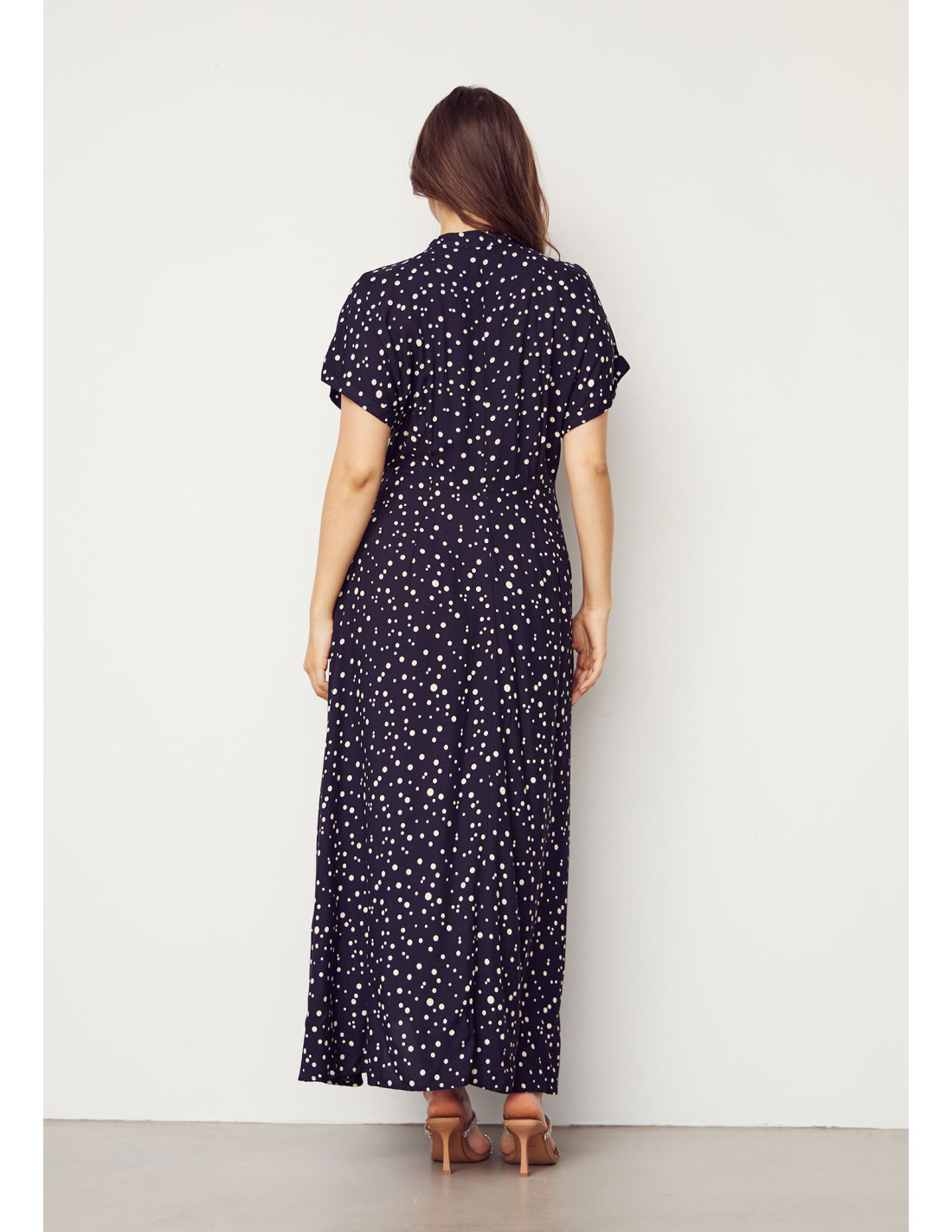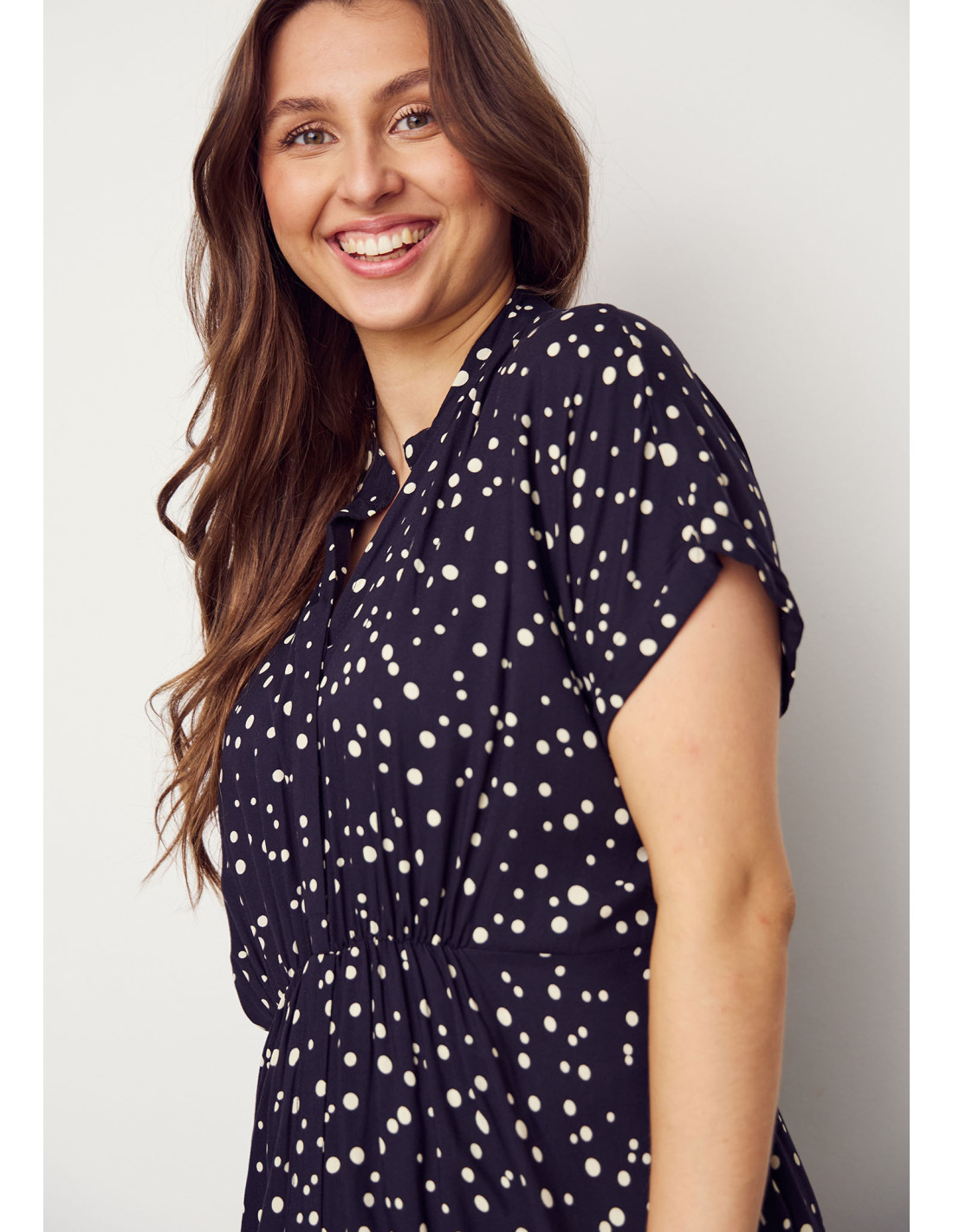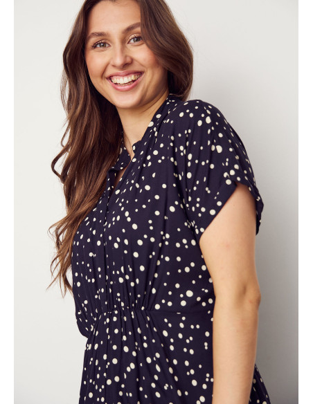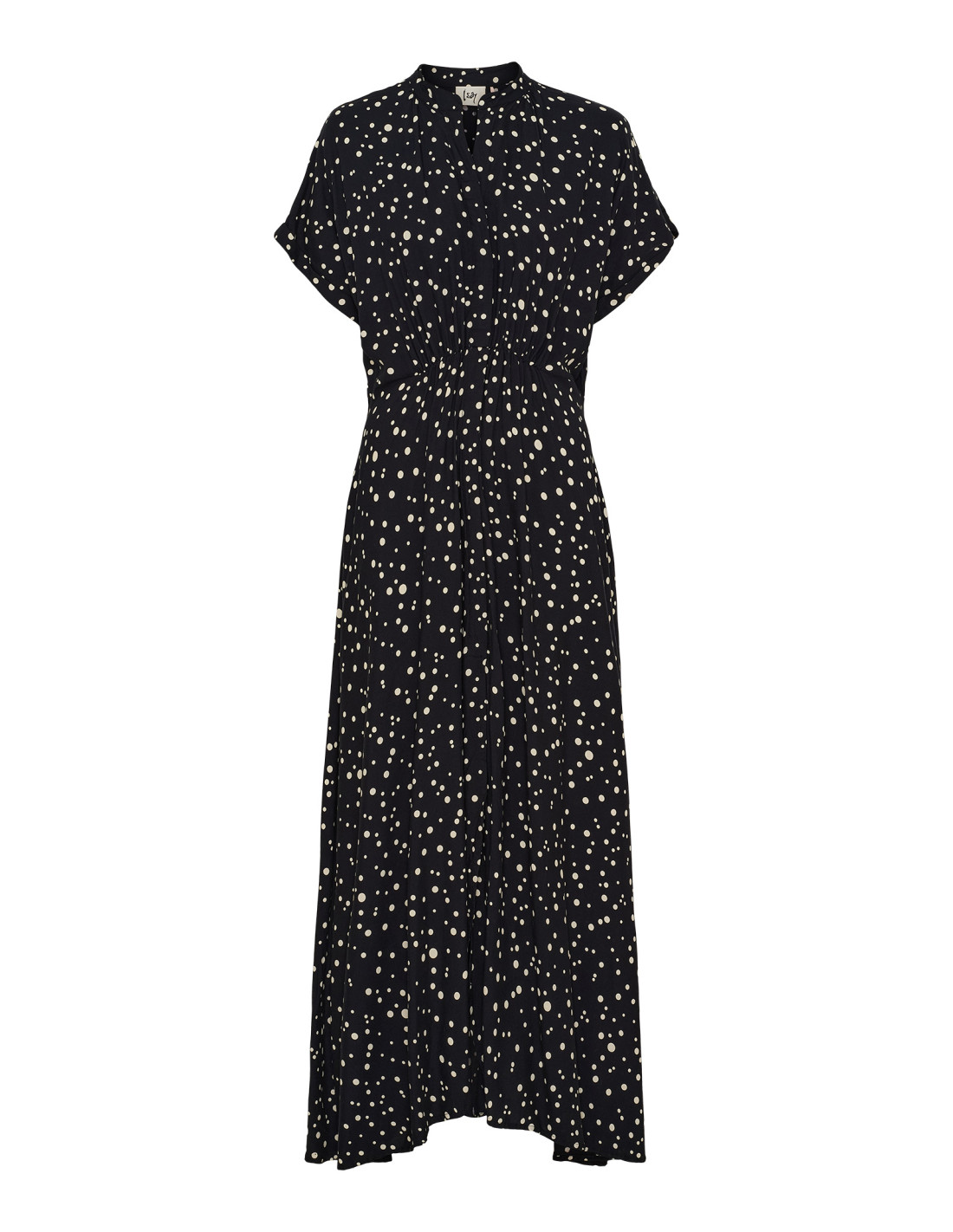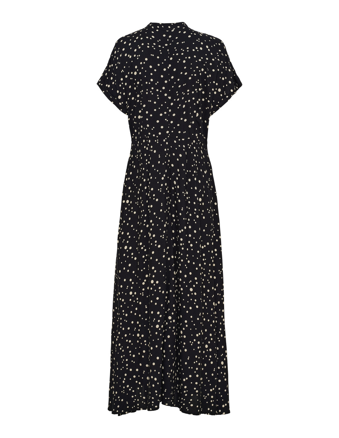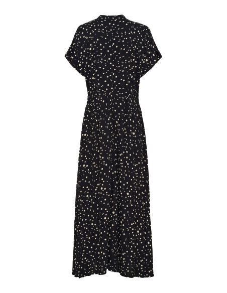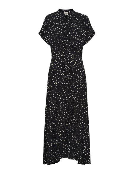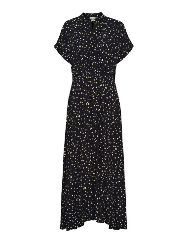 är en feminin klänning som kombinerar tidlös elegans med modern design. Den har en v-ringning med smockdetaljer, breda korta ärmar och en slits framtill som ger en sofistikerad touch. Klänningen är längre baktill, vilket skapar en vacker silhuett. Tillverkad av 80% LENZING™ ECOVERO™ viskos och 20% polyamid erbjuder den både komfort och hållbarhet. Den elastiska midjan säkerställer en perfekt passform, och den lösa passformen ger rörelsefrihet. Längden på storlek M är 134 cm.