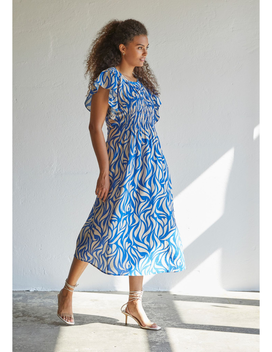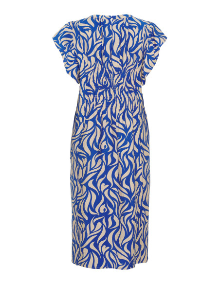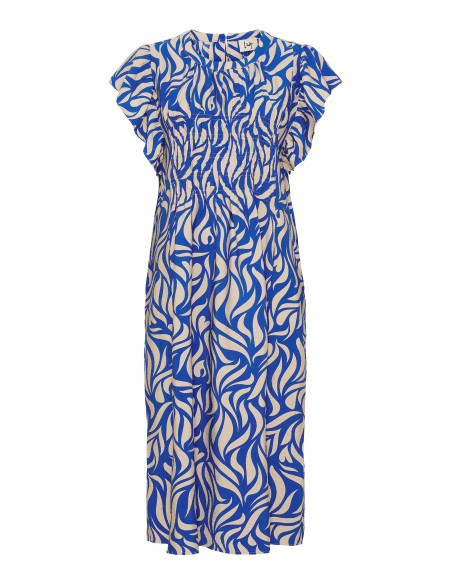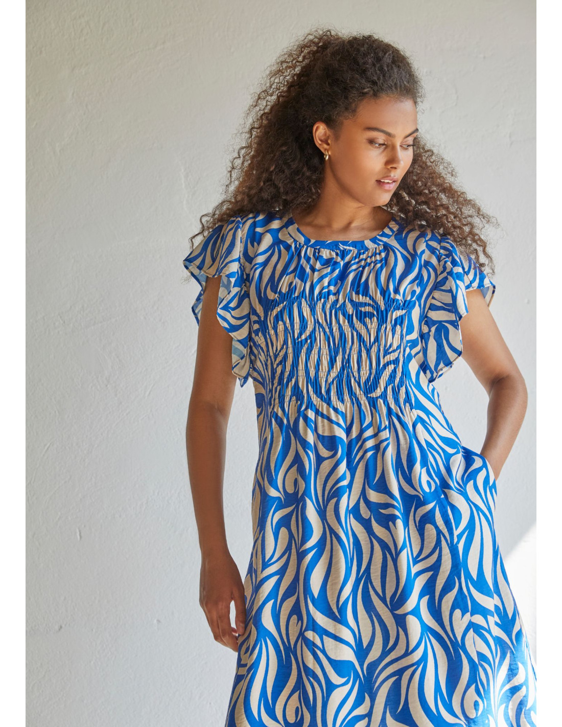 är en midi-klänning som kombinerar elegans med komfort. Den har korta, voluminösa ärmar, en rund halsringning och en rynkad smockeffekt över bröstet, vilket ger en smickrande passform. Klänningen är tillverkad i ett lätt och luftigt viskosmaterial som andas, vilket gör den idealisk för varmare dagar. Den lösa passformen ger rörelsefrihet och komfort hela dagen.