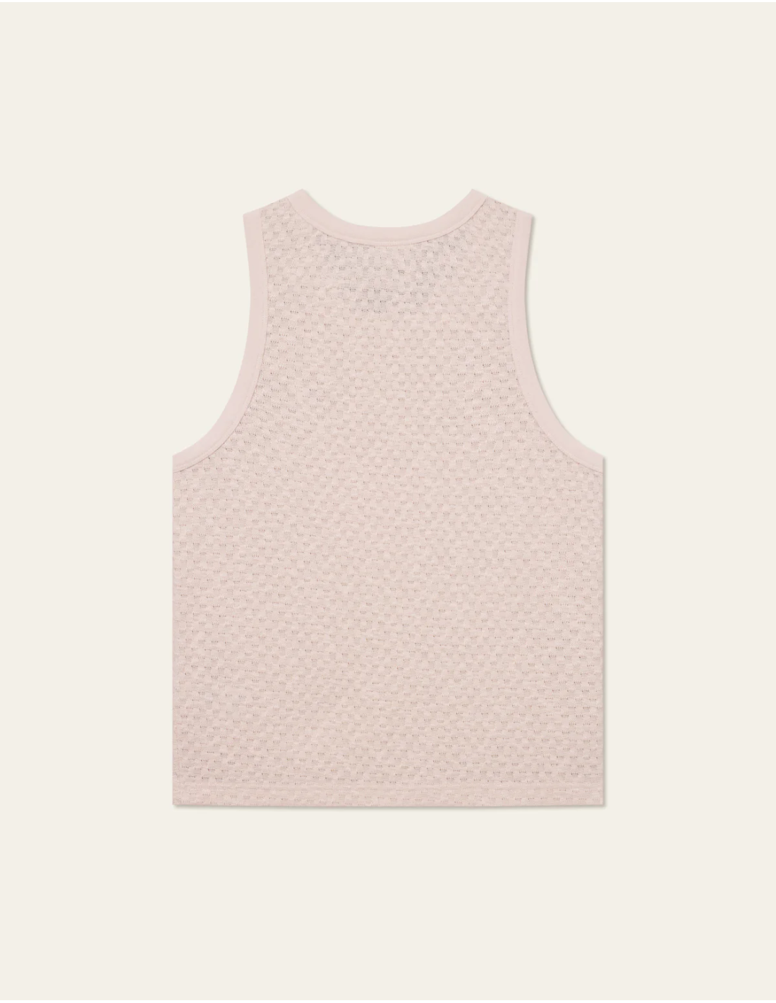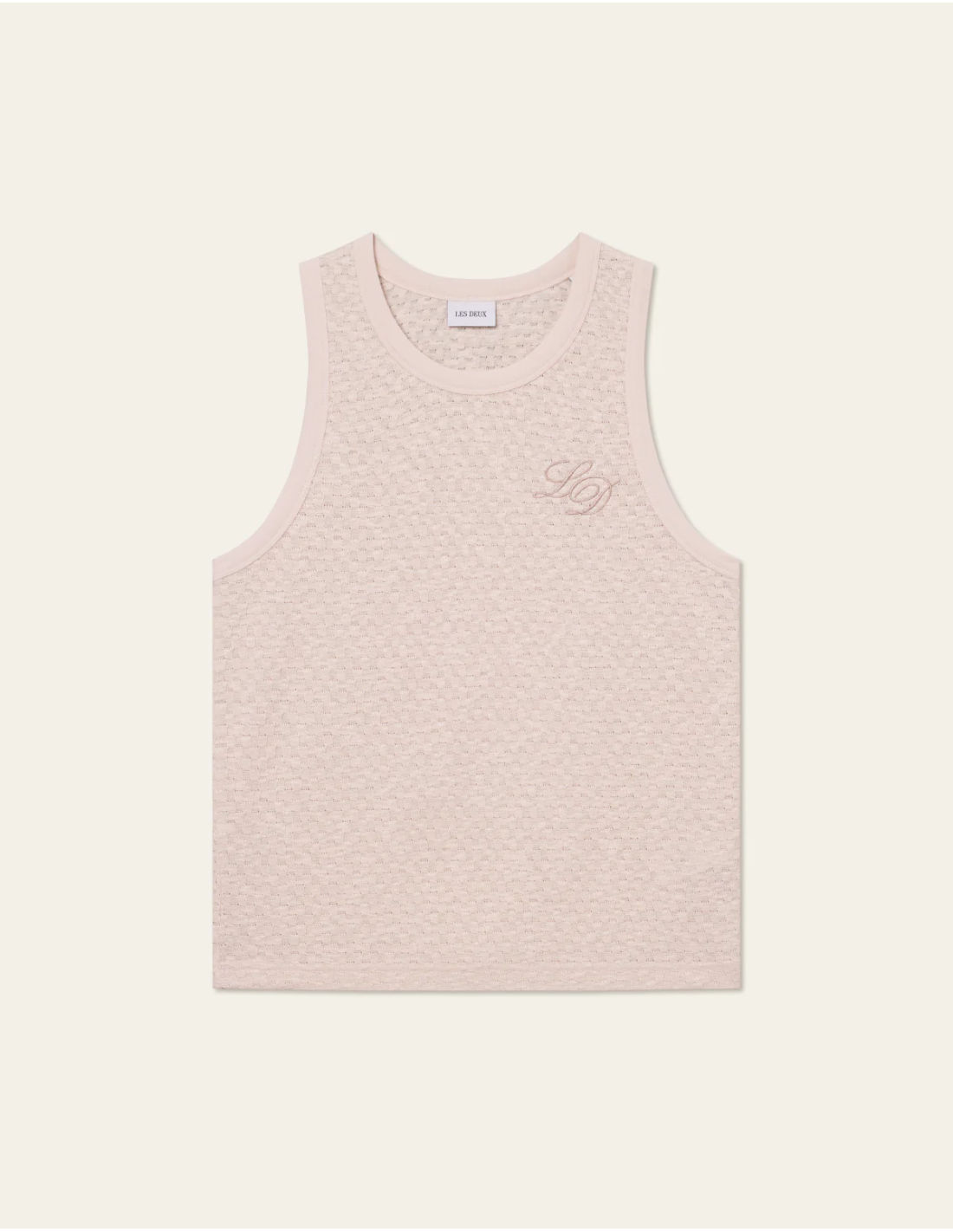 är ett stiligt och mångsidigt baslager med en modern twist. Den genombrutna stickningen ger en lätt och luftig känsla, vilket gör att linnet passar perfekt för varmare dagar eller som ett lager under andra plagg. Tanktoppen har en tidlös design med ett broderat varumärkesmonogram på vänster bröst, vilket ger en subtil men stilfull detalj.