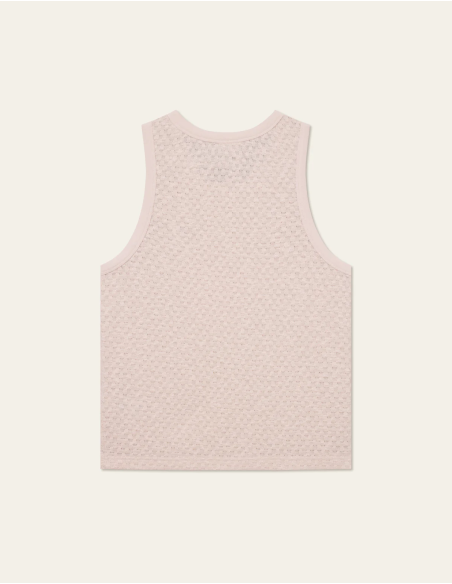 är ett stiligt och mångsidigt baslager med en modern twist. Den genombrutna stickningen ger en lätt och luftig känsla, vilket gör att linnet passar perfekt för varmare dagar eller som ett lager under andra plagg. Tanktoppen har en tidlös design med ett broderat varumärkesmonogram på vänster bröst, vilket ger en subtil men stilfull detalj.