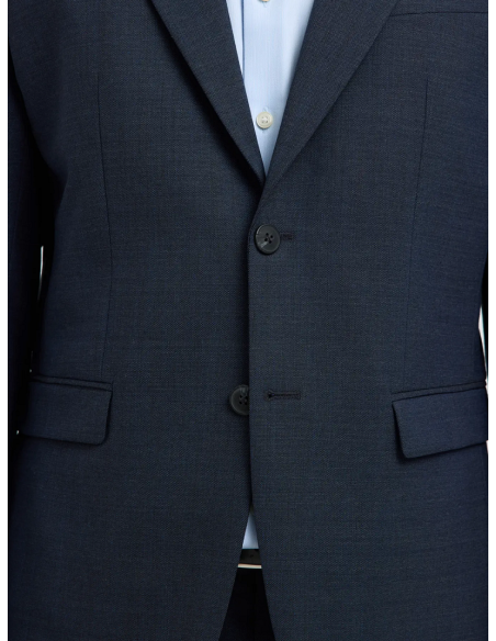 Kavajen har klassisk notch-revers, knappar på ärmsluten, jetted framfickor, en bröstficka och dubbla slitsar bak. Halvfodrad i polyester för en lätt och icke-genomskinlig känsla. Skuren i en premium twillväv med 55 % RWS-certifierad ull, 41 % återvunnen polyester och 4 % elastan för smidig passform och rörelsefrihet – idealisk för formella tillfällen eller kontorsmiljöer. Dubbla slitsar och skräddade darts ger en elegant siluett.