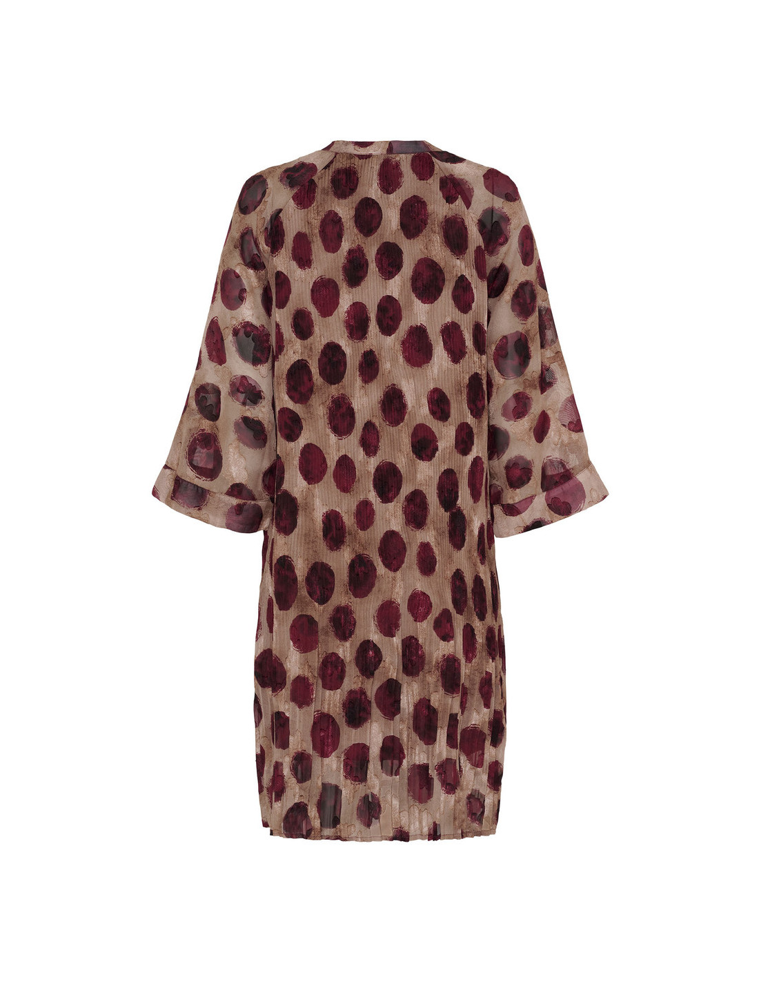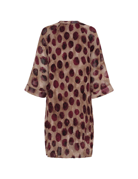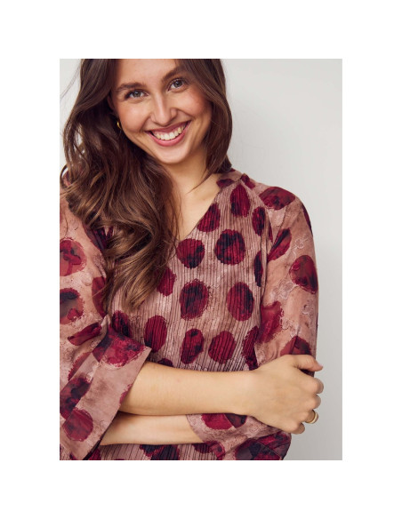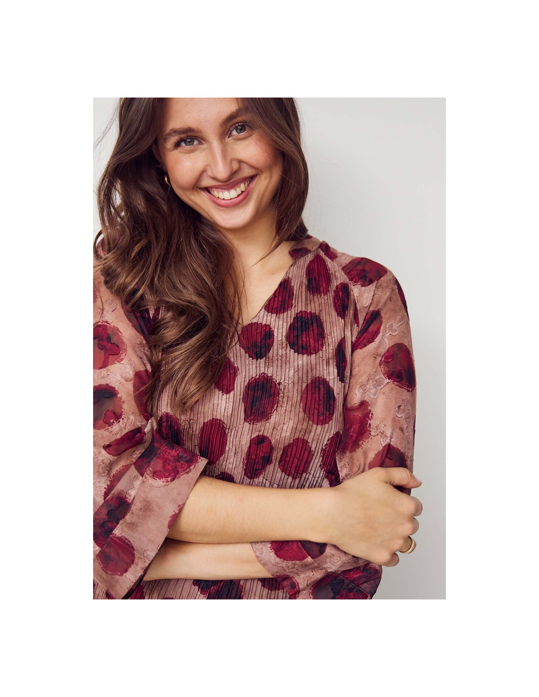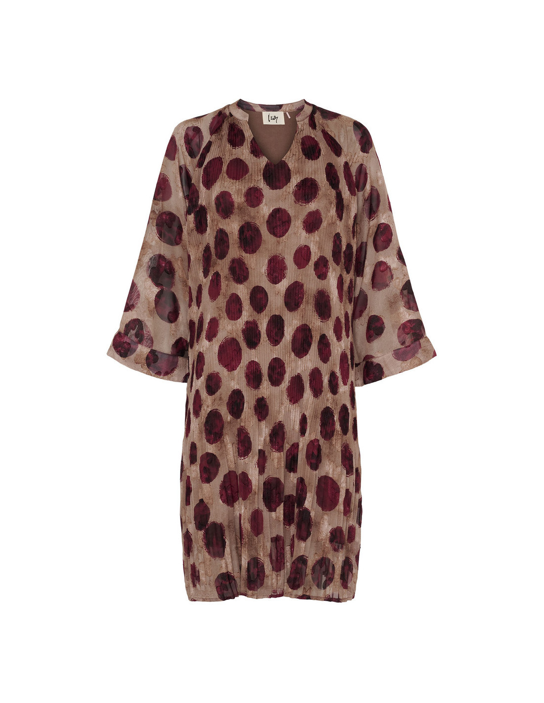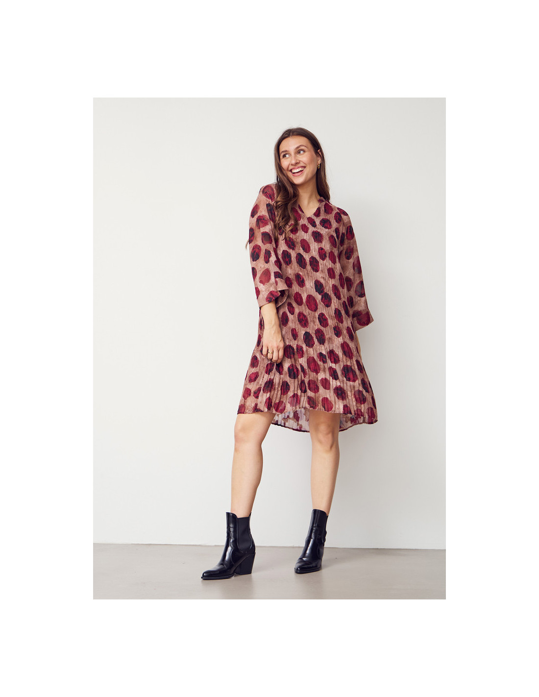 En elegant veckad midiklänning med v-ringning, breda ärmar och rak, avslappnad passform. Tillverkad i lätt polyester med stretchigt viskosfoder som ger både komfort och rörelsefrihet. Perfekt för både vardag och fest – en självklar favorit i garderoben.