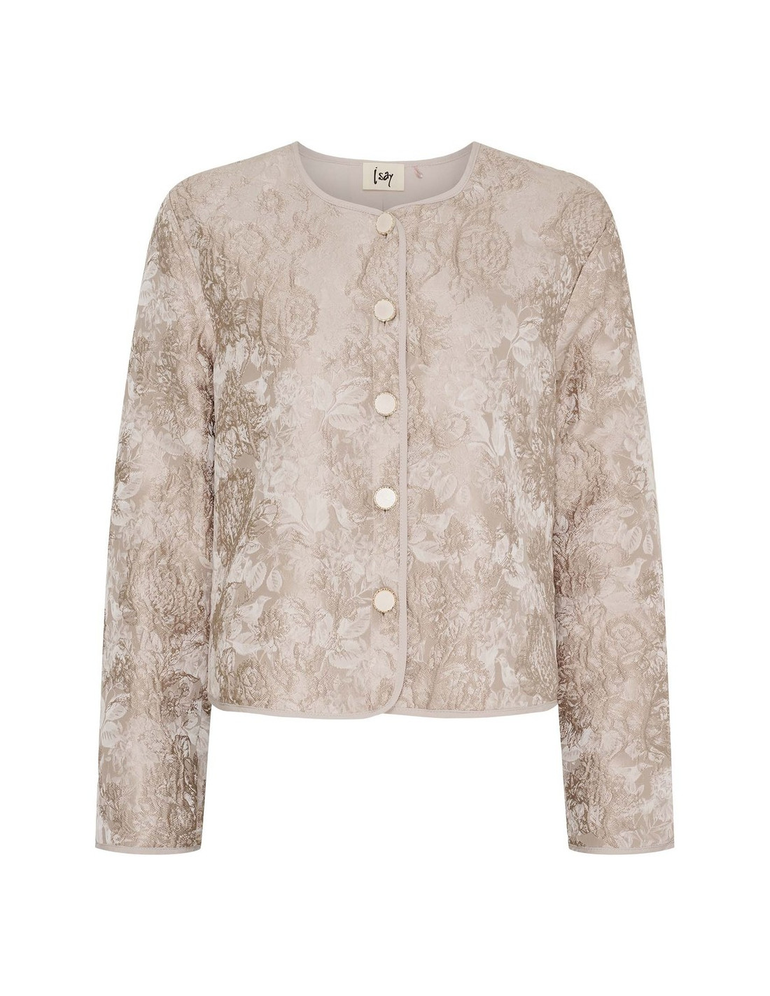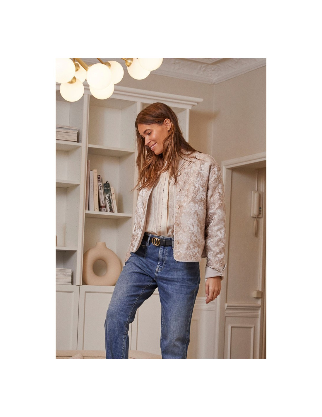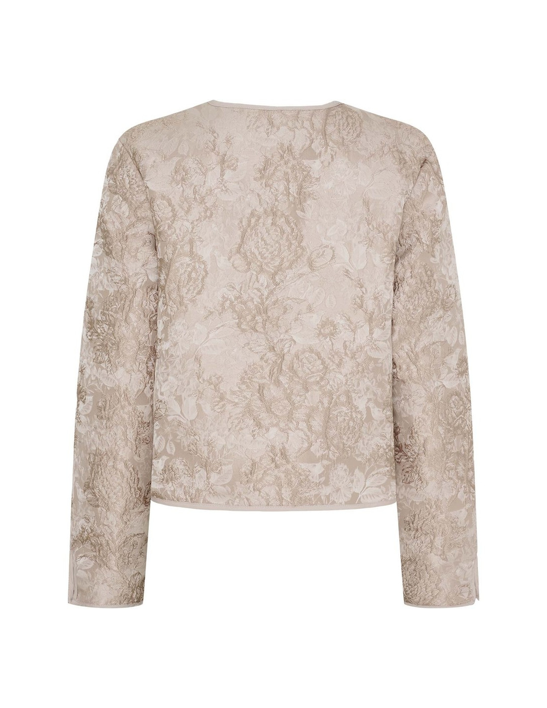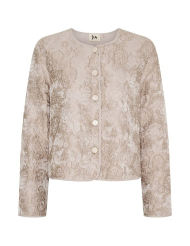 En elegant, kort jacka med exklusivt brokadmönster och dekorativa knappar. Klassisk rund halsringning, långa ärmar och en lätt, fodrad kvalitet som gör den bekväm hela dagen. Den korta, lösa passformen ger en sofistikerad och feminin silhuett – perfekt till både jeans och klänning.