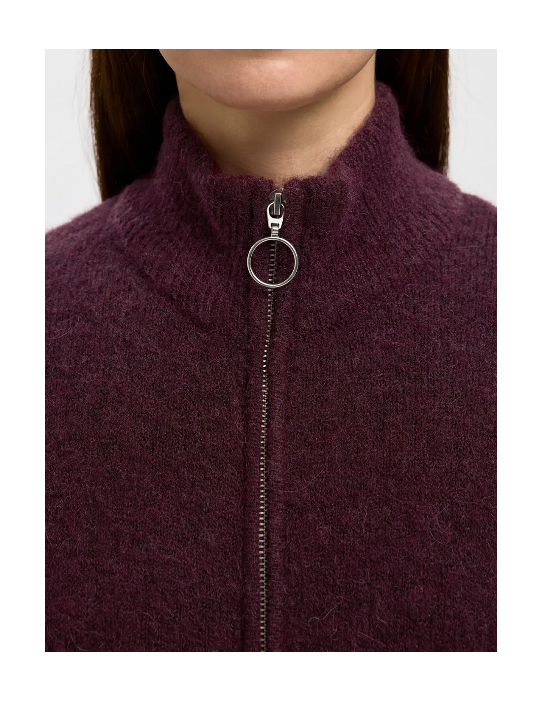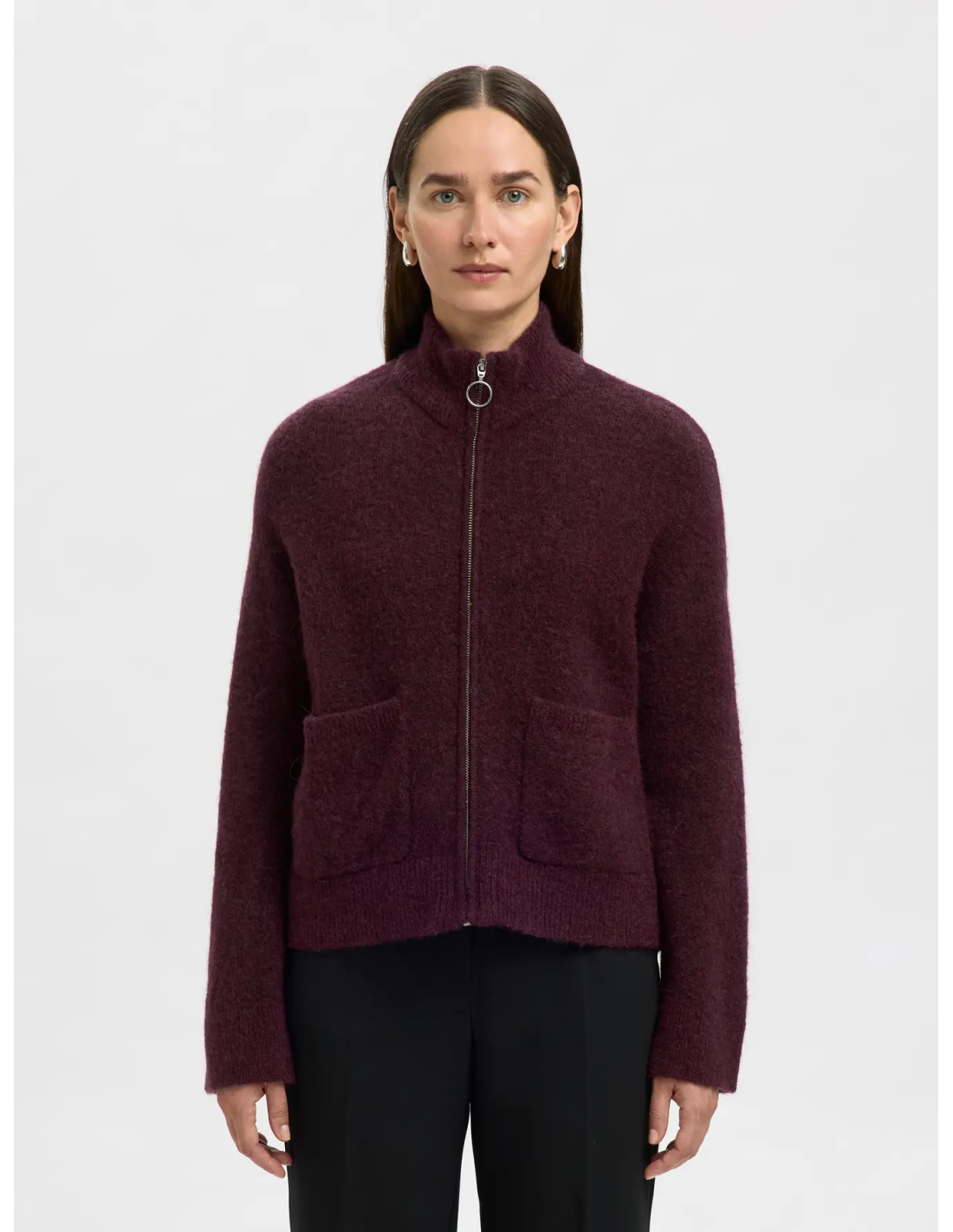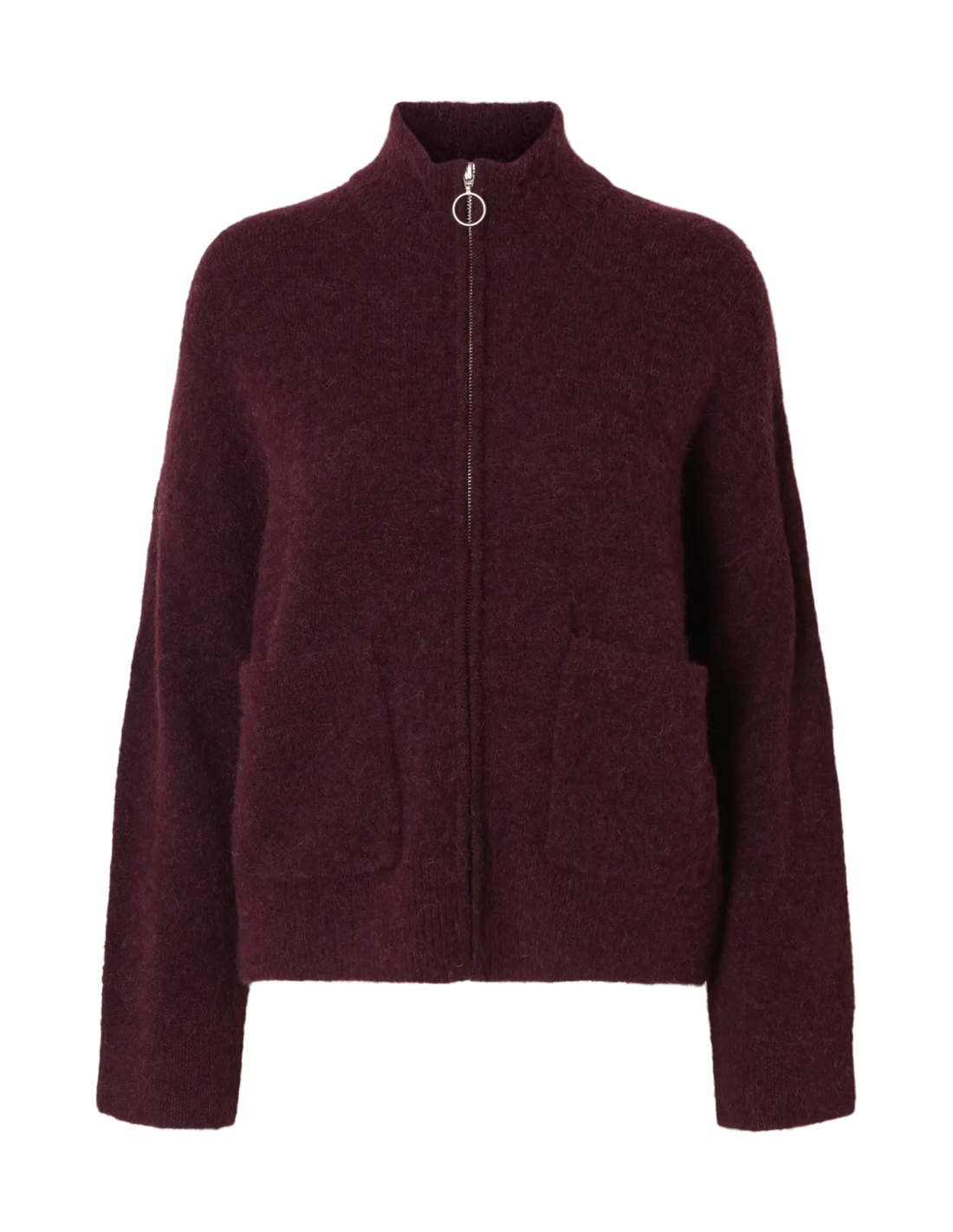 från Selected Femme är en mjuk och lyxig kofta i ull- och alpackablandning med ribbad hög krage och blixtlås med dekorativ dragkläpp. Den har nedsänkta axlar, långa ärmar, ribbade muddar och stora påsydda framfickor som ger en mysig och avslappnad look.