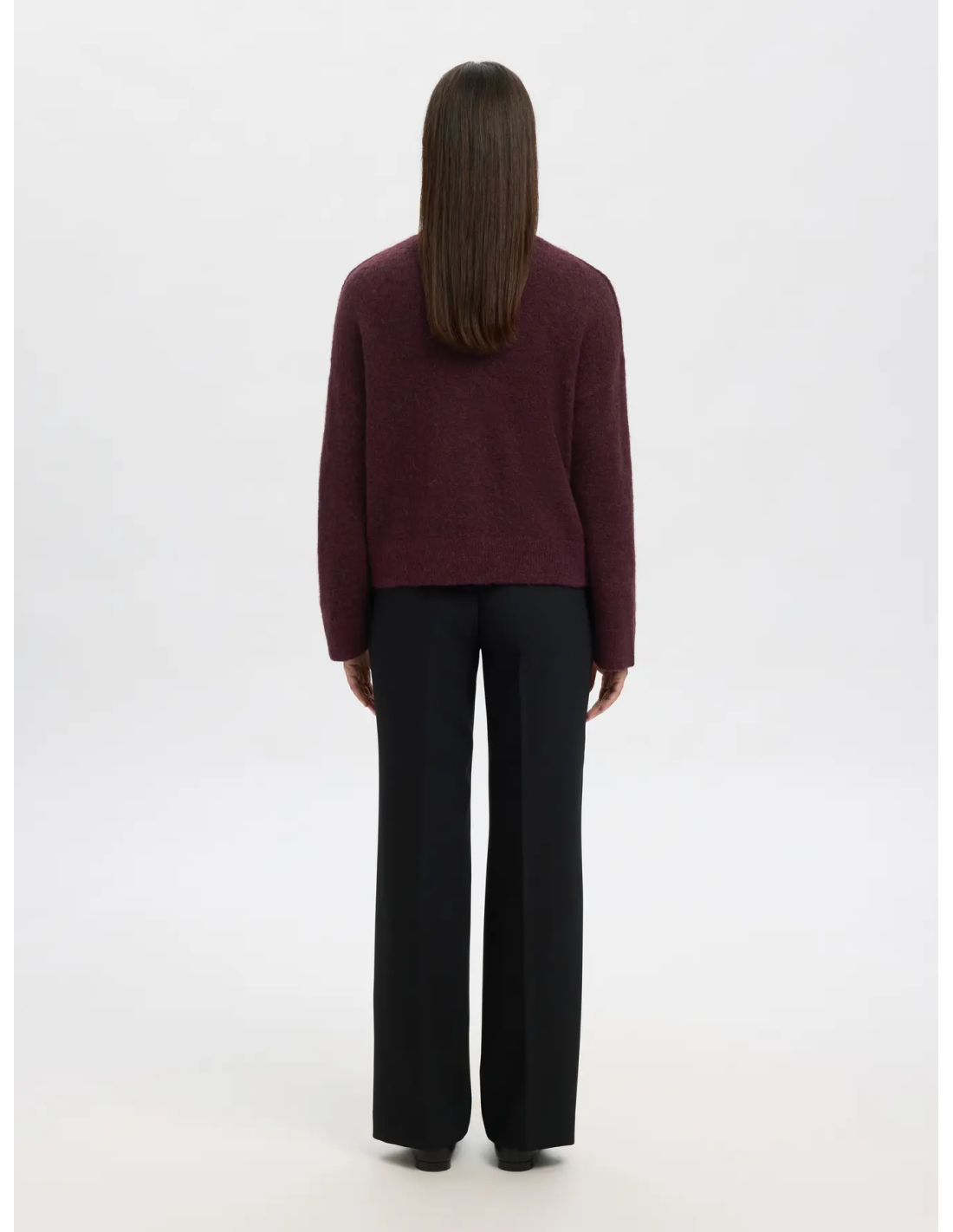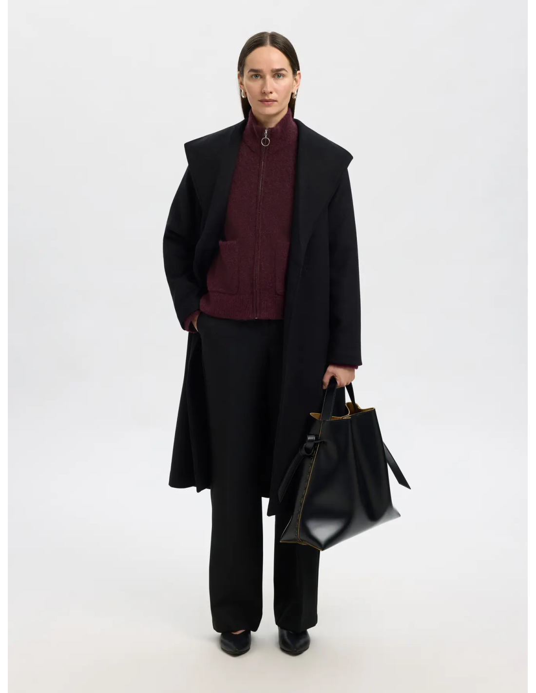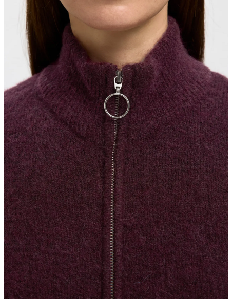 från Selected Femme är en mjuk och lyxig kofta i ull- och alpackablandning med ribbad hög krage och blixtlås med dekorativ dragkläpp. Den har nedsänkta axlar, långa ärmar, ribbade muddar och stora påsydda framfickor som ger en mysig och avslappnad look.