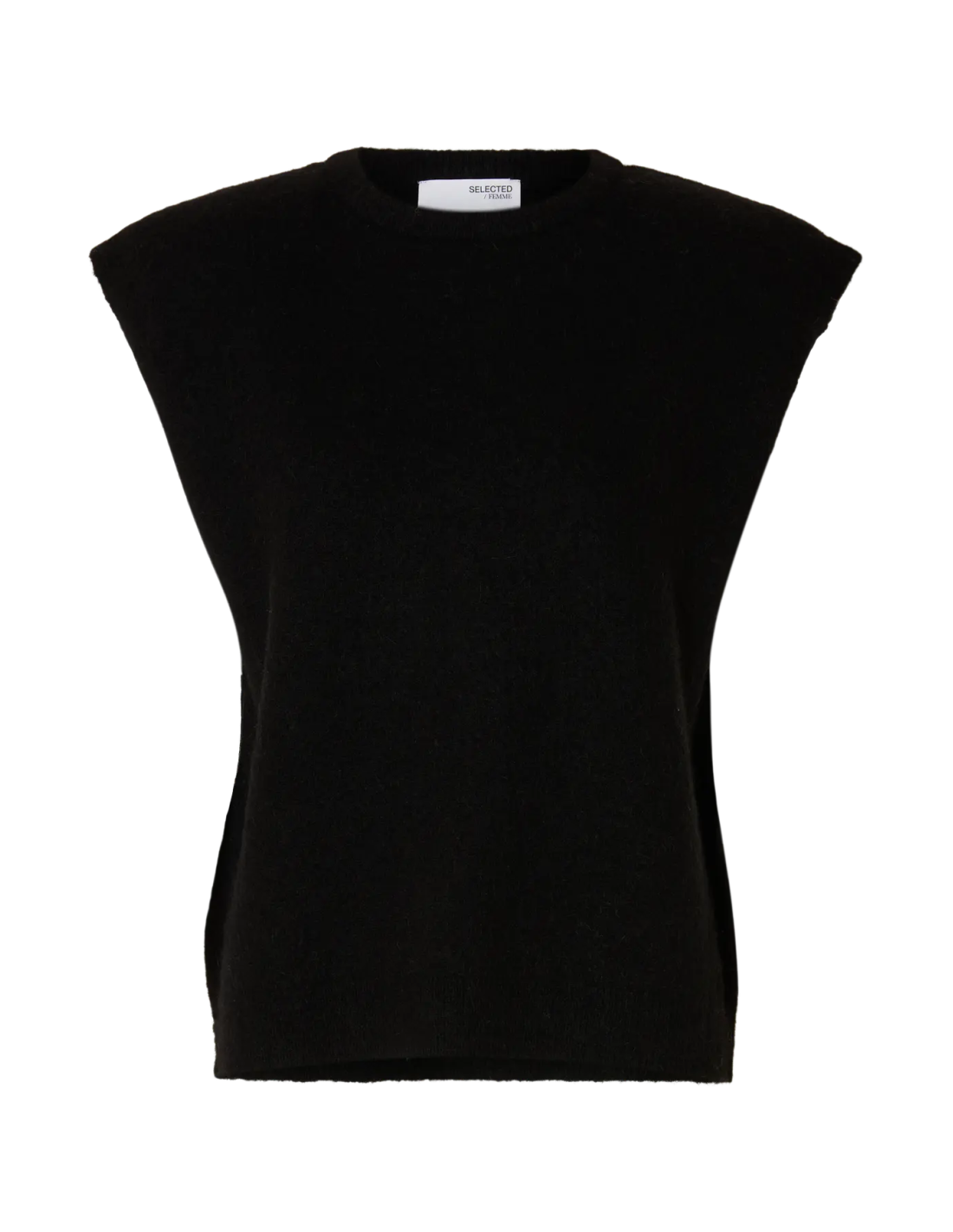 från Selected Femme är en tidlös stickad väst med rund hals och ärmlös design. Den är tillverkad i en mjuk och värmande ull- och alpackablandning med en klassisk passform som gör den lätt att bära över skjortor, blusar eller klänningar.