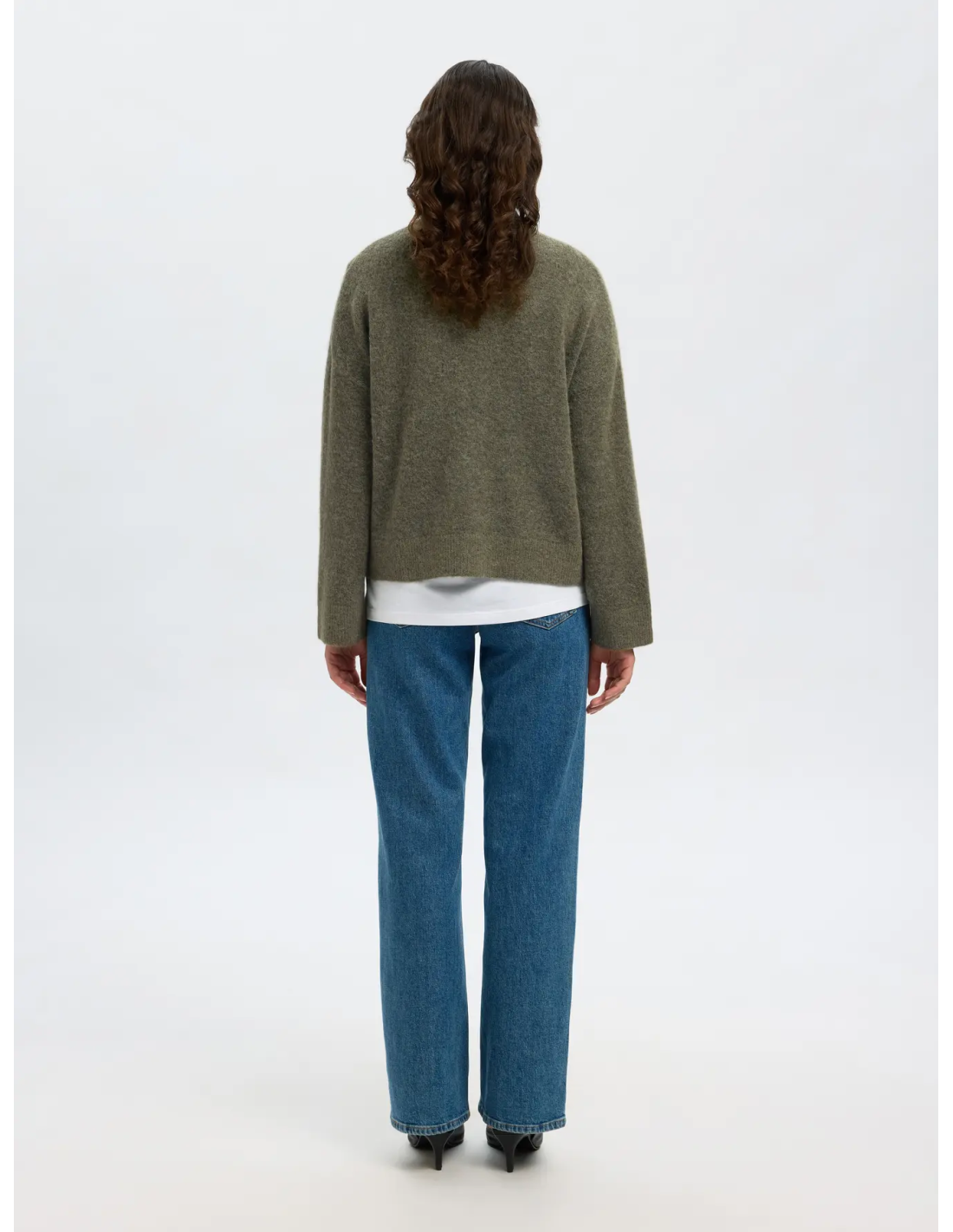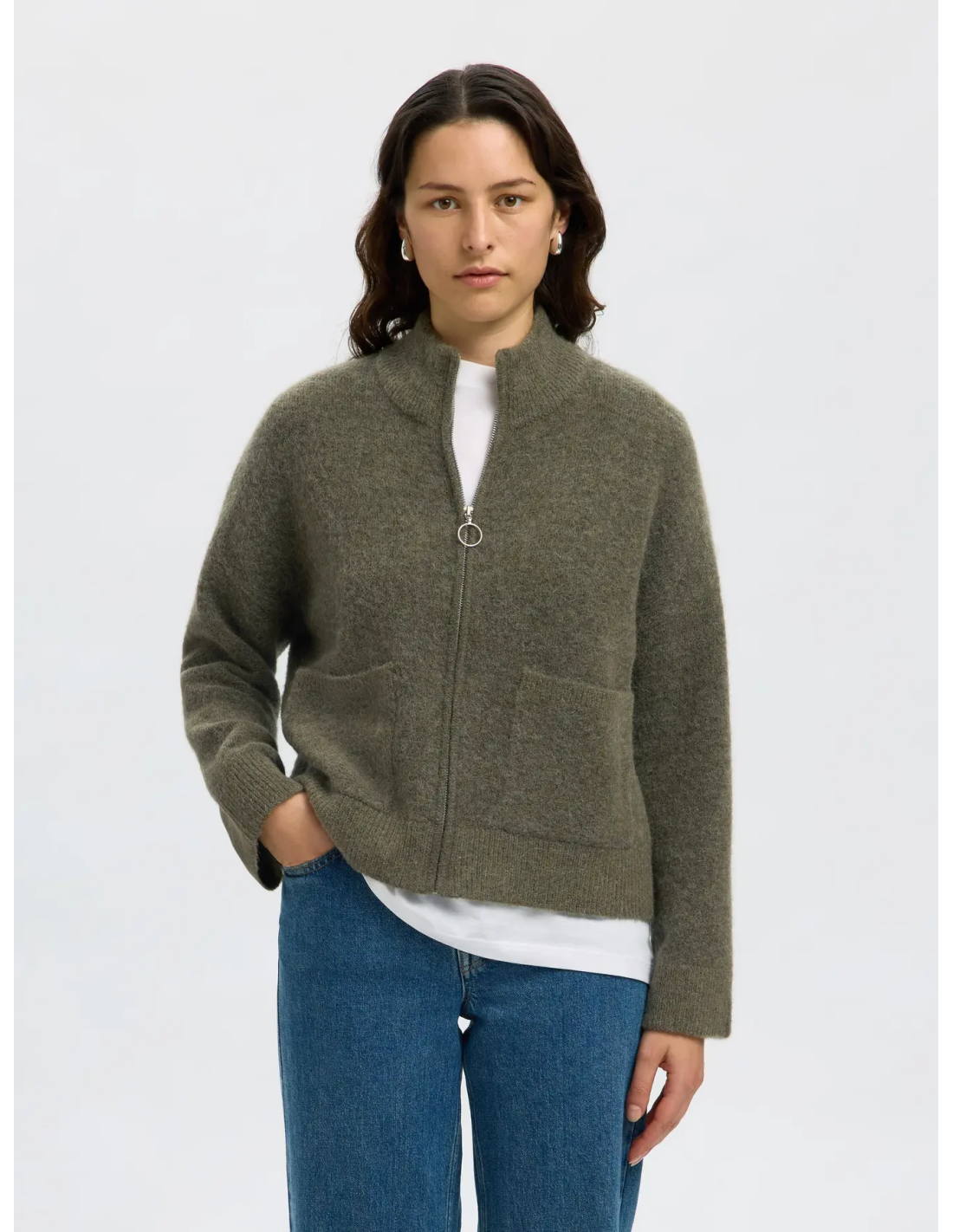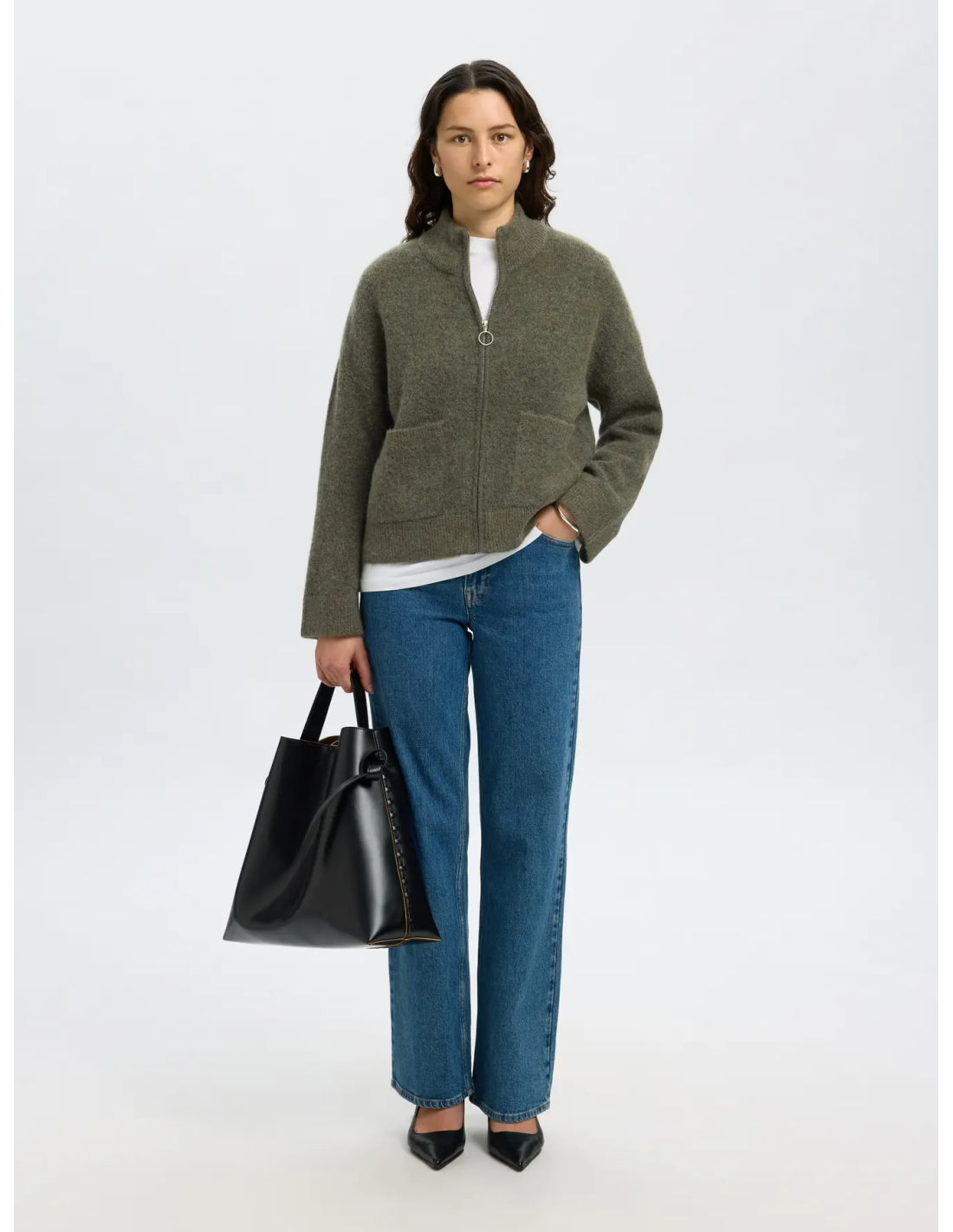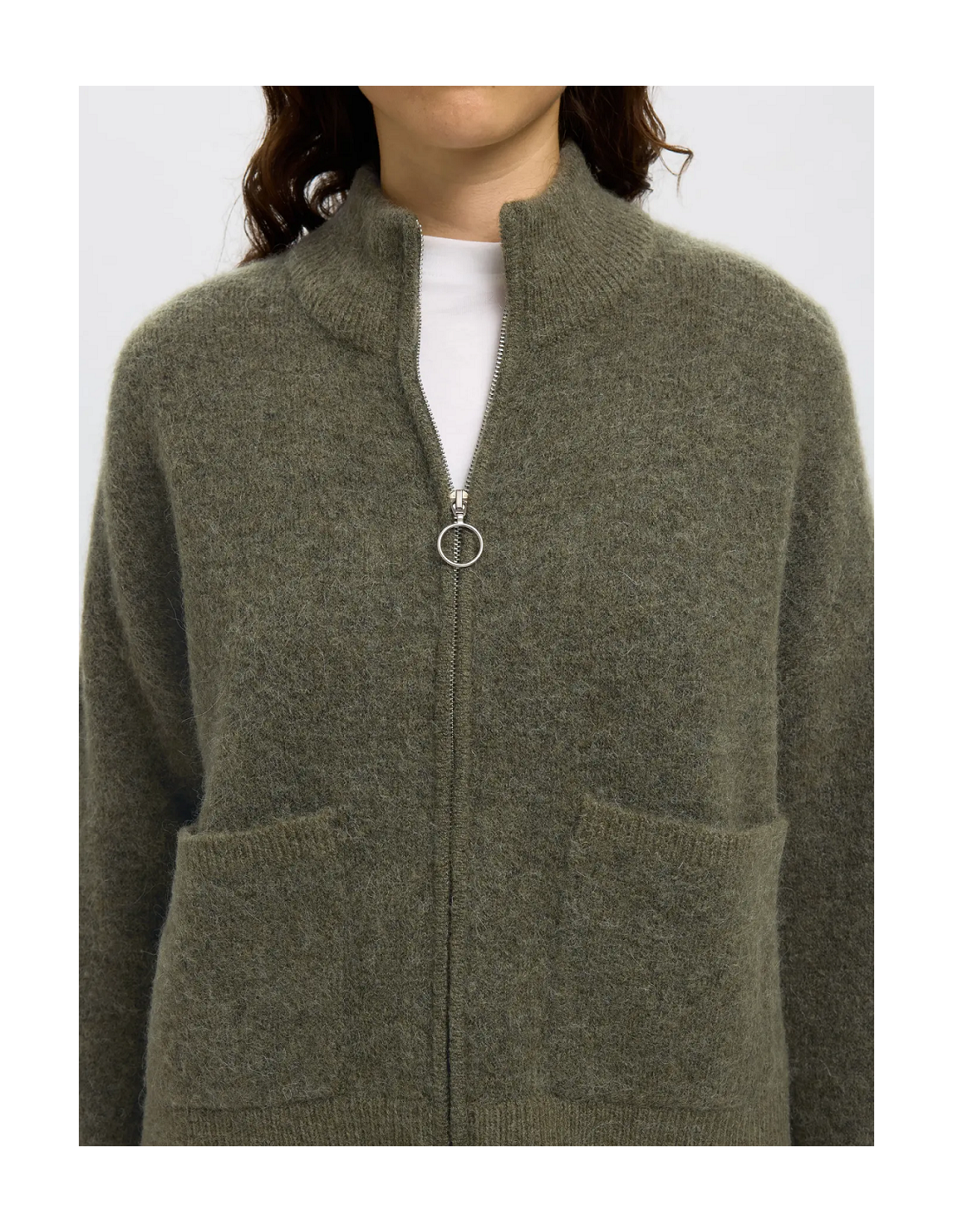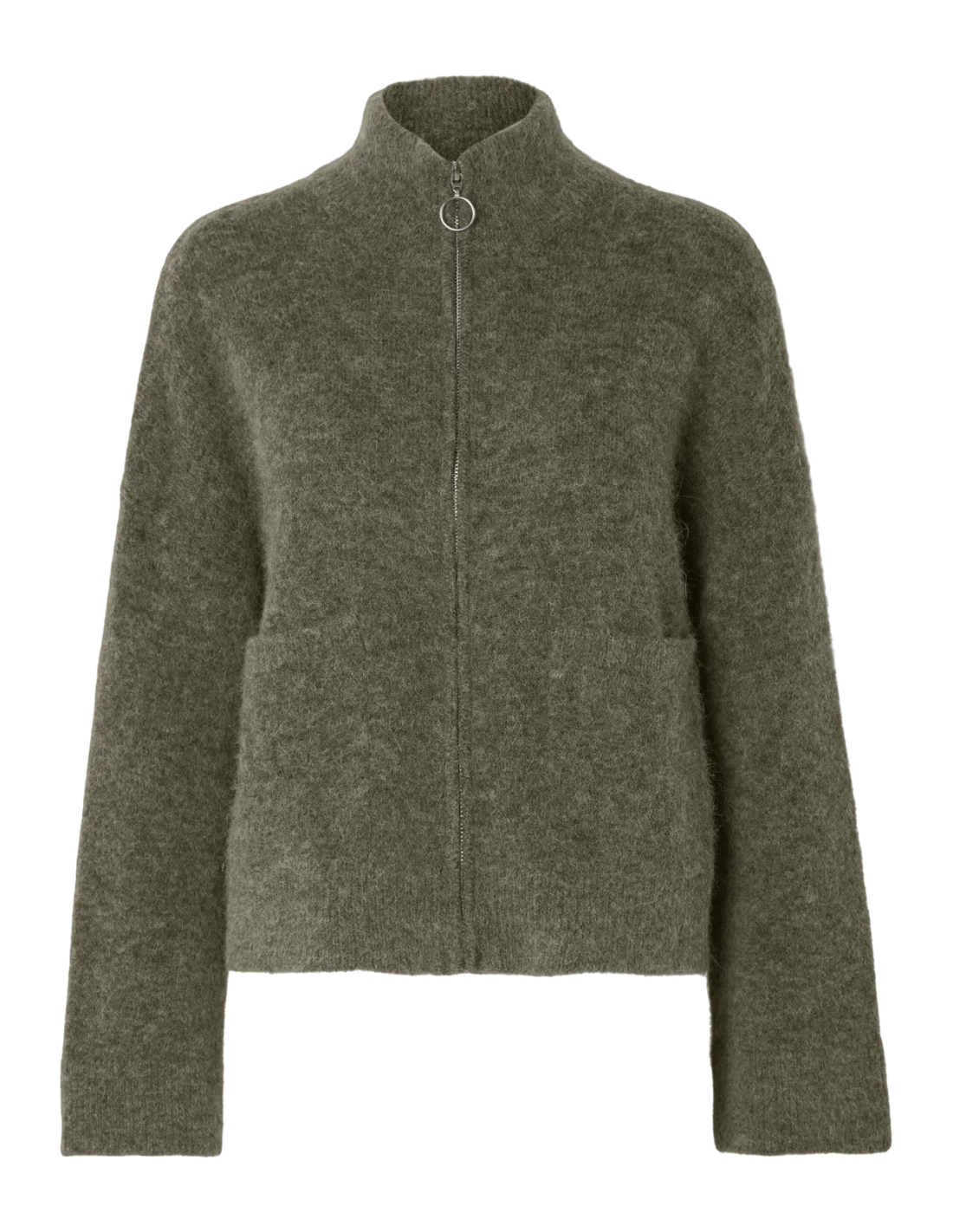 från Selected Femme är en mjuk och lyxig kofta i ull- och alpackablandning med ribbad hög krage och blixtlås med dekorativ dragkläpp. Den har nedsänkta axlar, långa ärmar, ribbade muddar och stora påsydda framfickor som ger en mysig och avslappnad look.