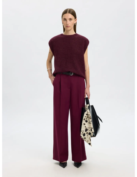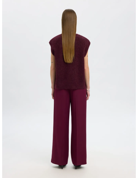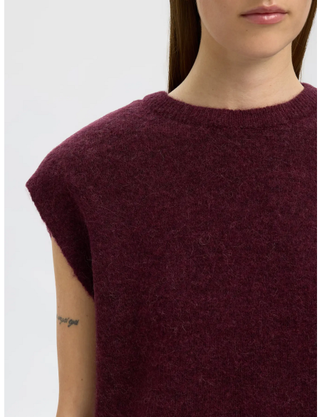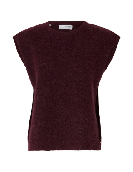 från Selected Femme är en tidlös stickad väst med rund hals och ärmlös design. Den är tillverkad i en mjuk och värmande ull- och alpackablandning med en klassisk passform som gör den lätt att bära över skjortor, blusar eller klänningar.