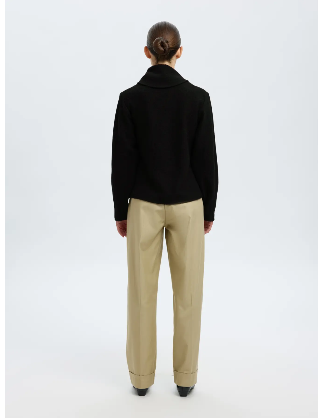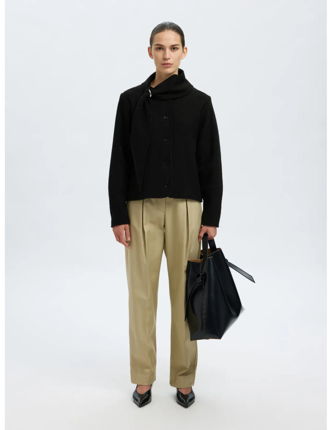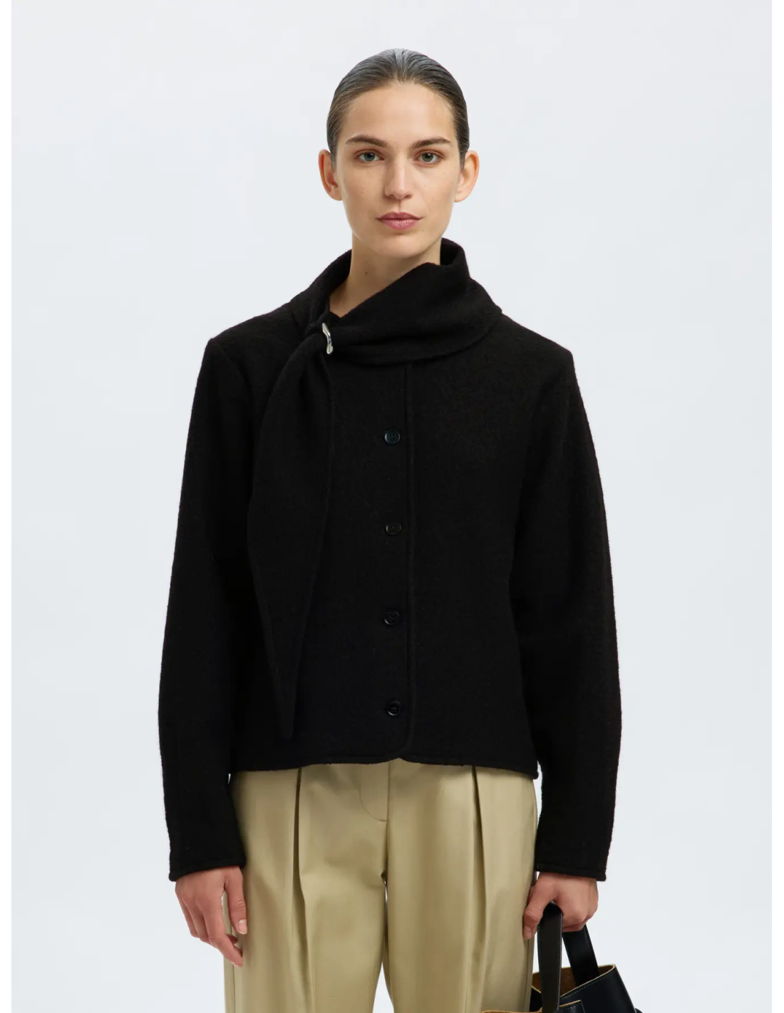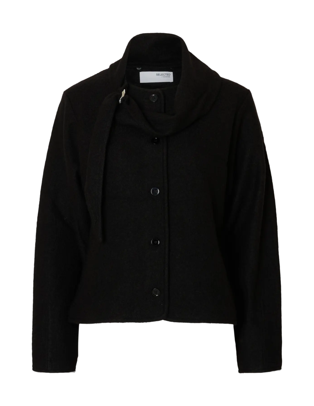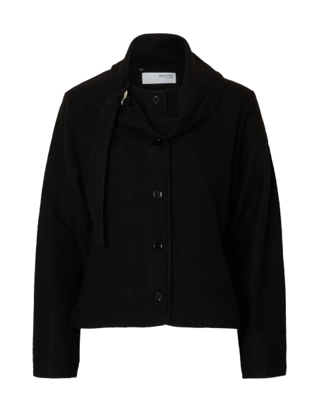 från Selected Femme är en kort, elegant ulljacka med krage som övergår i en inbyggd halsduk. Den har knappstängning framtill, långa ärmar och ett metallspänne i halsen som ger ett exklusivt uttryck. Tillverkad i 100 % certifierad ull för en lyxig känsla och ansvarsfull produktion.