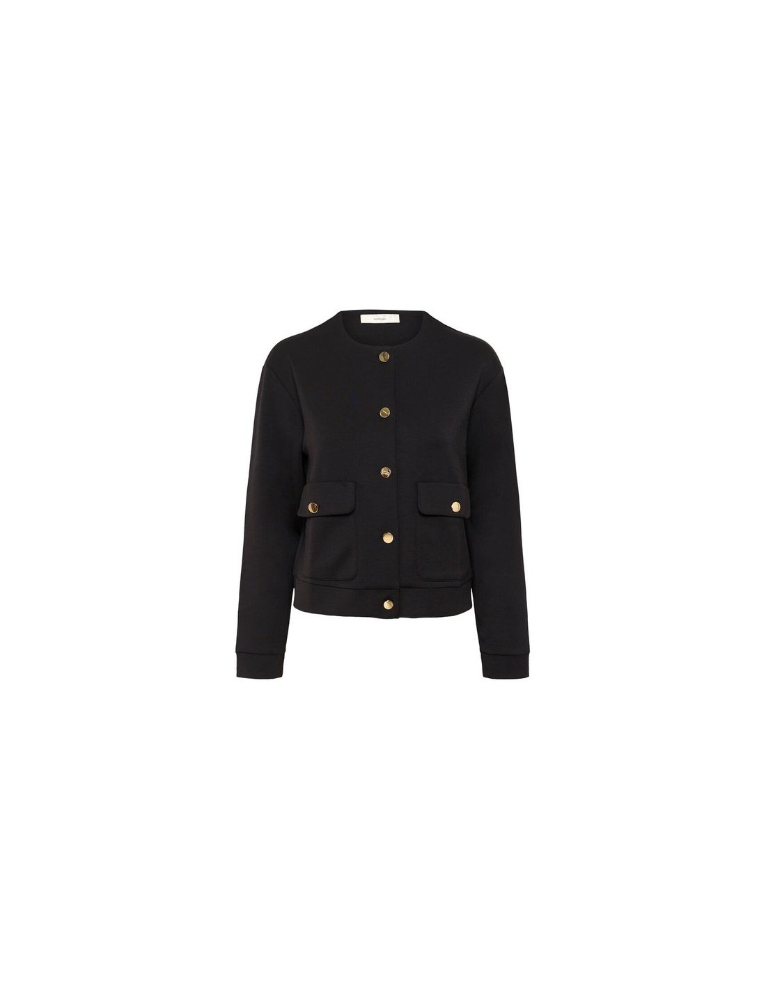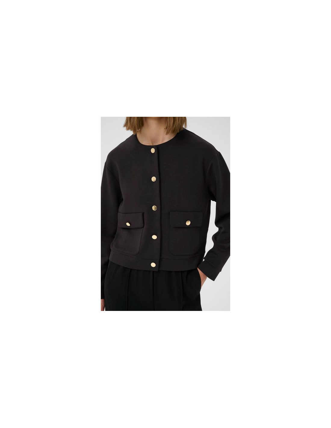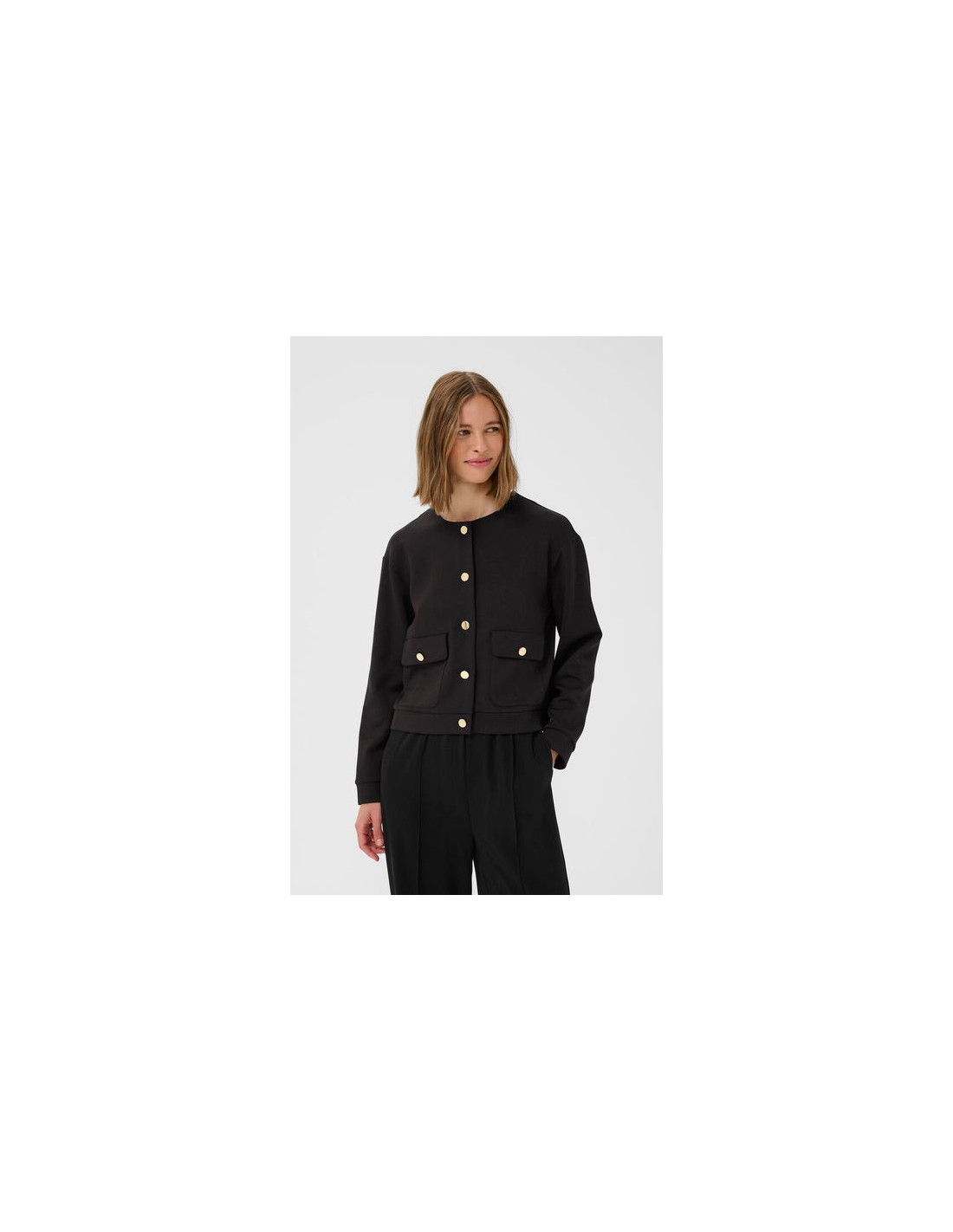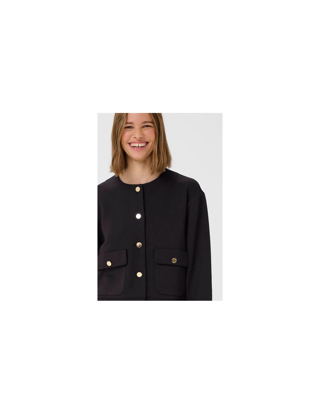 Modern jacka i mjuk stickad kvalitet med klassisk passform. Den har rund halsringning, lång ärm och dekorativa knappar som ger ett sofistikerat uttryck. Med sin kortare längd och praktiska fickor är den enkel att bära till både klänning, blus eller byxa. Den stretchiga materialmixen ger hög komfort och följsamhet – perfekt för både arbete och vardag med stil.