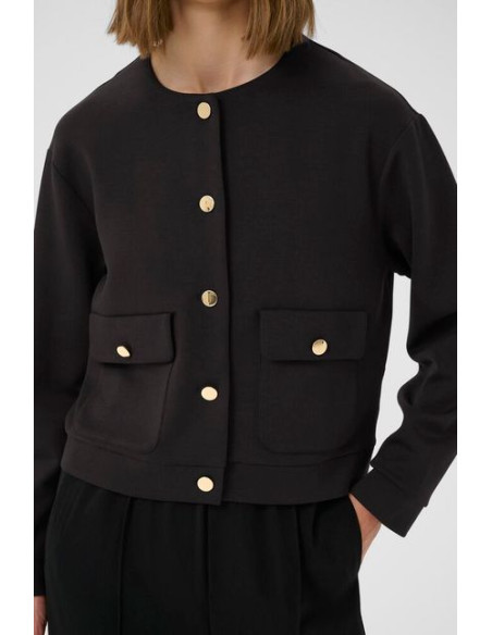 Modern jacka i mjuk stickad kvalitet med klassisk passform. Den har rund halsringning, lång ärm och dekorativa knappar som ger ett sofistikerat uttryck. Med sin kortare längd och praktiska fickor är den enkel att bära till både klänning, blus eller byxa. Den stretchiga materialmixen ger hög komfort och följsamhet – perfekt för både arbete och vardag med stil.