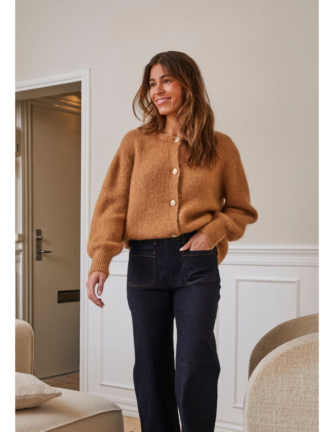 • Detaljer: Rund halsringning, knäppning fram, mjuk och fluffig stickkvalitet, lätt struktur