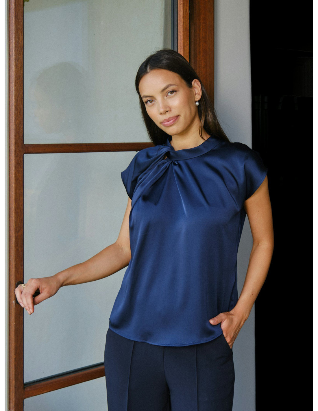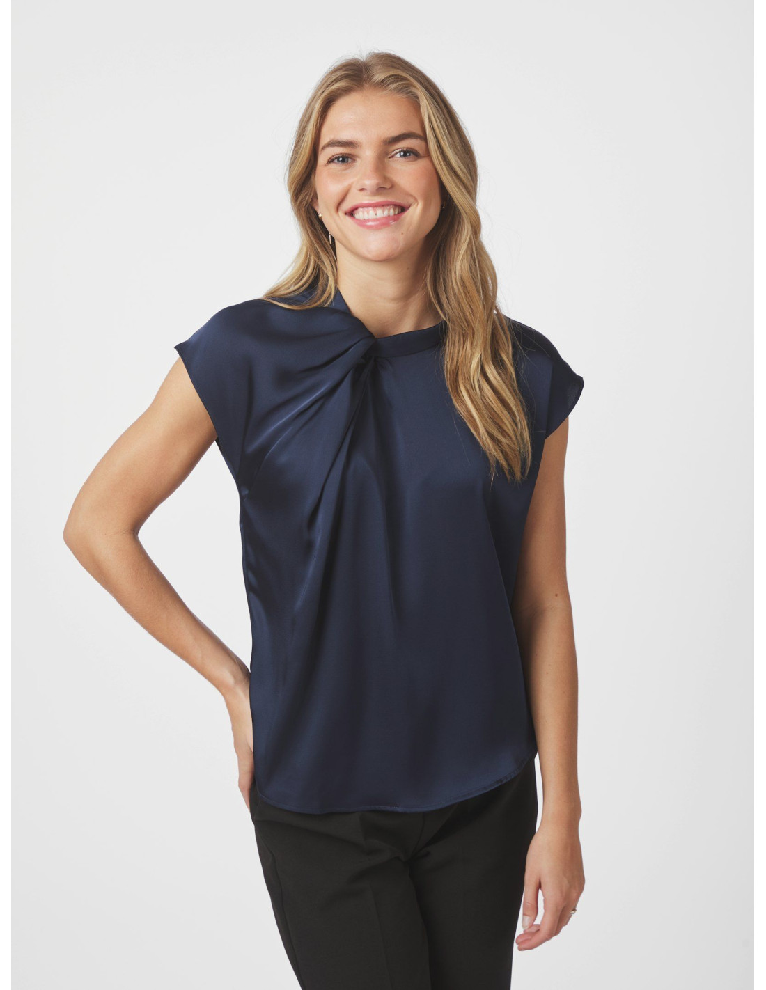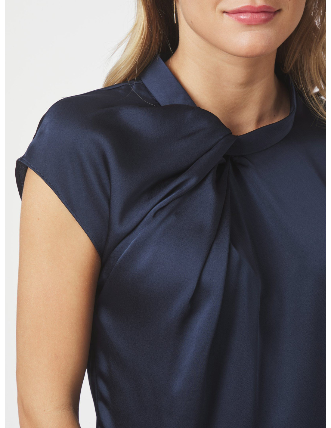 Fleur Drapy Satin Blouse är en drapig och feminin blus i mjuk satin med vacker knutdetalj vid halsen. Den har korta ärmar och en lös men figursmickrande passform som gör den både bekväm och stilfull. Perfekt att klä upp till fest eller bära mer avslappnat till vardags.