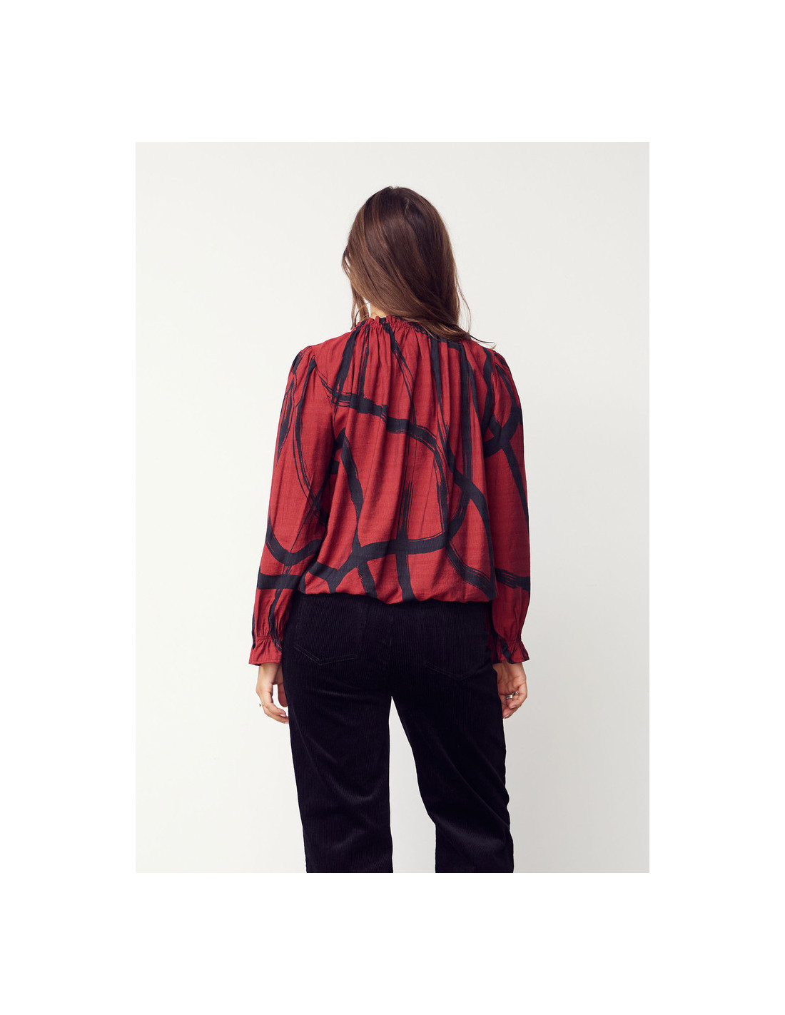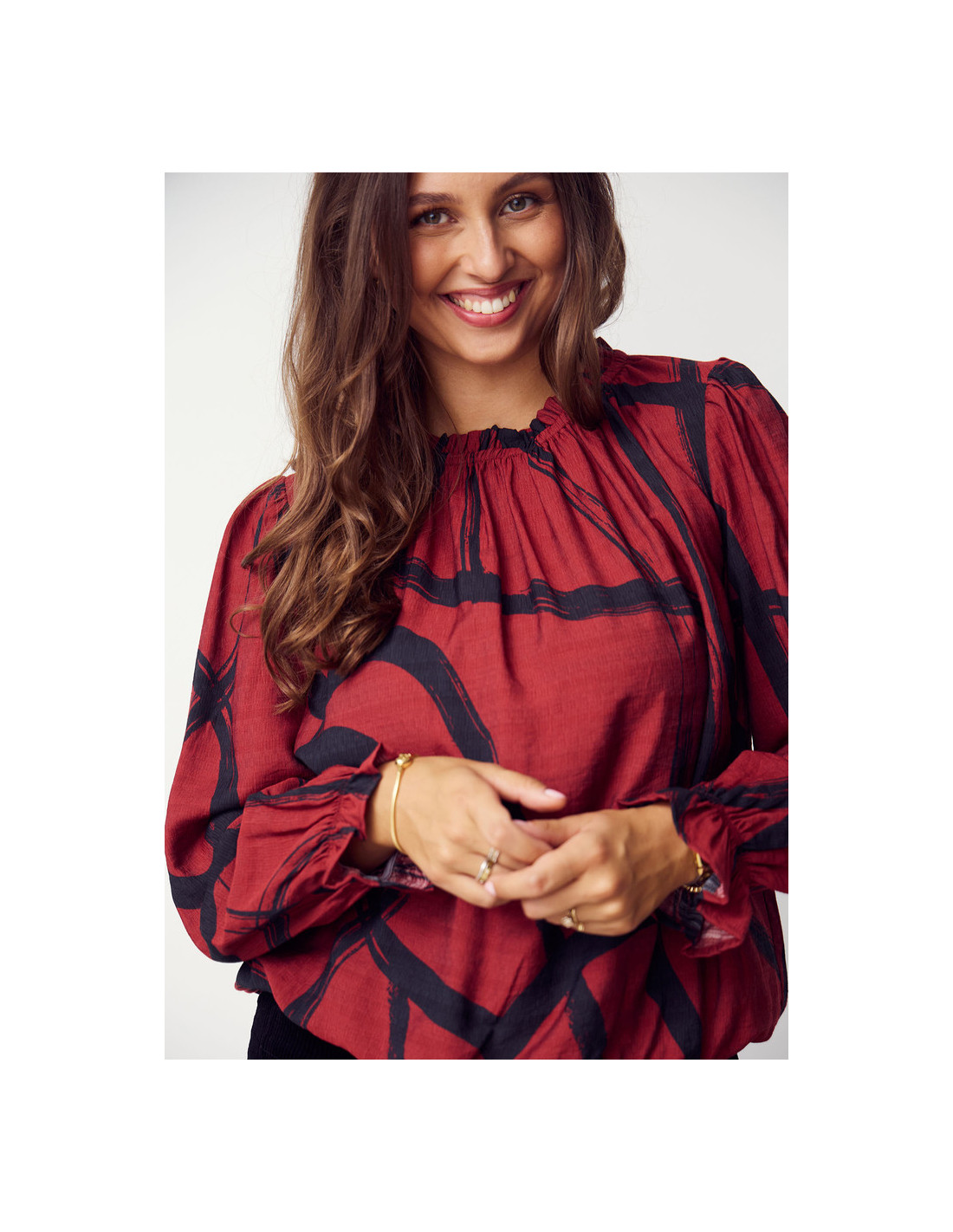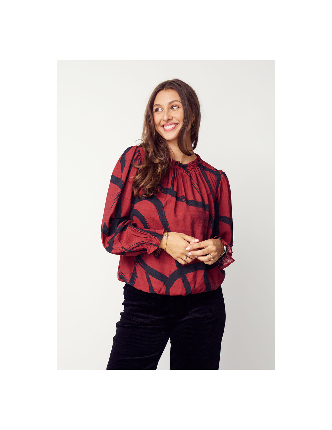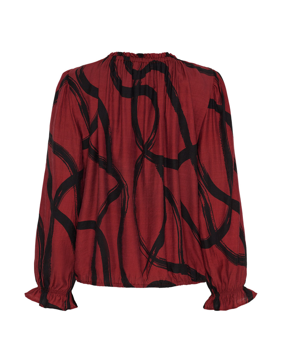 Tanna Printed Blouse är en lätt och luftig blus med en vacker, vid passform som ger en elegant och feminin silhuett. De elastiska volangkanterna vid hals och ärmslut skapar fina rynkade detaljer som ger blusen extra karaktär. Tillverkad i en mjuk blandning av 80% LENZING™ ECOVERO™ viskos och 20% polyamid – ett hållbart och miljömärkt material som ger både komfort och andningsförmåga. Det svarta och röda mönstret adderar ett sofistikerat uttryck som passar lika bra till vardags som till fest. Perfekt att styla med denim eller klassiska byxor för en avslappnat chic look.