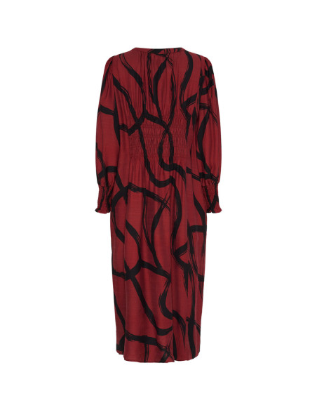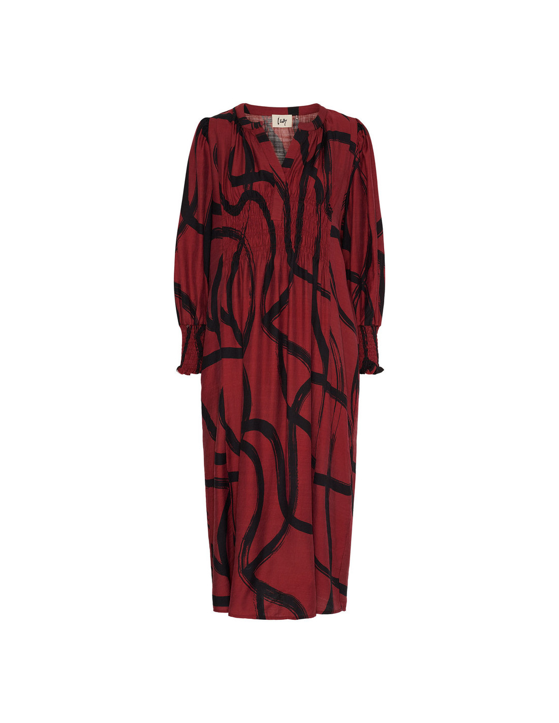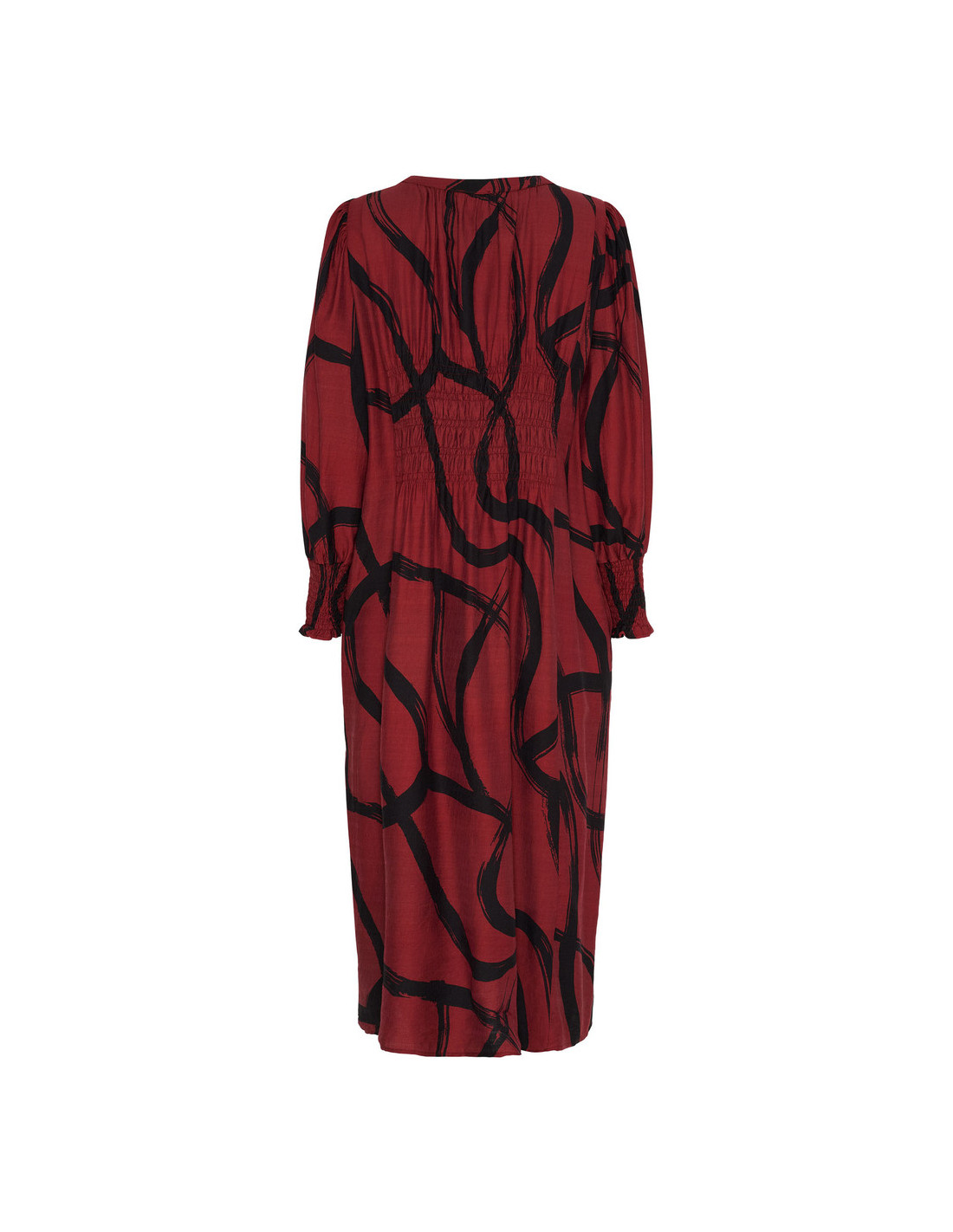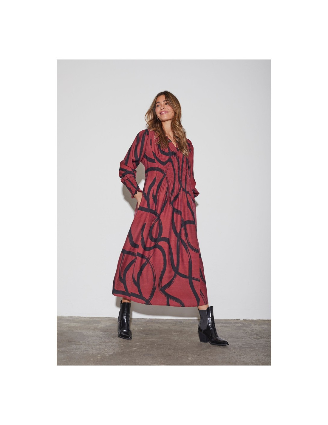 En luftig och feminin långklänning i mjuk viskoskvalitet som både faller vackert och känns behaglig mot huden. Den har en klassisk V-ringning med knäppning fram samt smockdetaljer framtill, baktill och vid ärmsluten som ger både form och flexibilitet. Klänningen har en lös passform som ger rörelsefrihet och en elegant drapering – perfekt för både vardag och speciella tillfällen.
